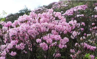 粉红、紫红的杜鹃花点缀于青山绿树间,尤其在战口河峡谷、大岭头观景台附近形成壮丽花海。