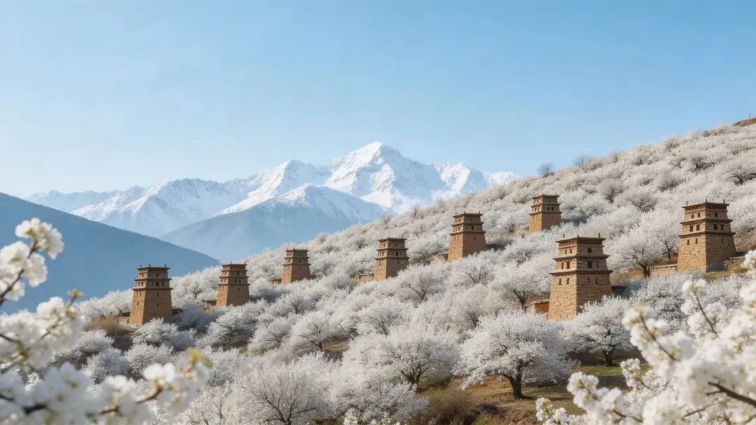 关键词:藏式碉楼、梨花盛开、高原春色