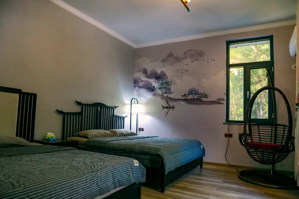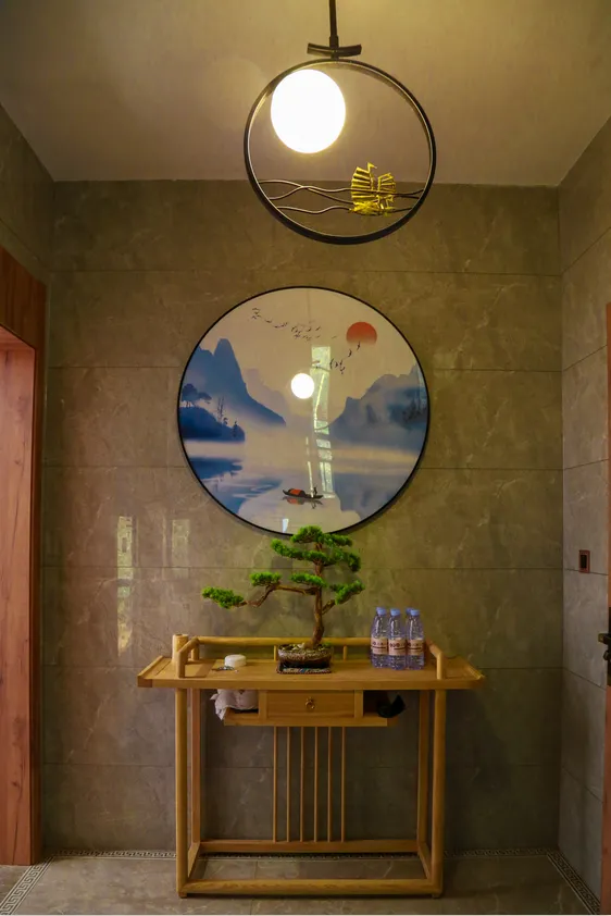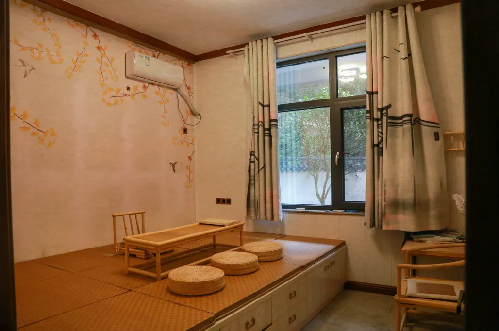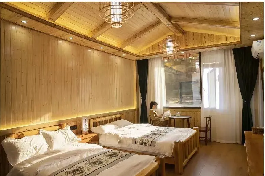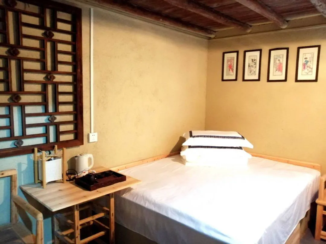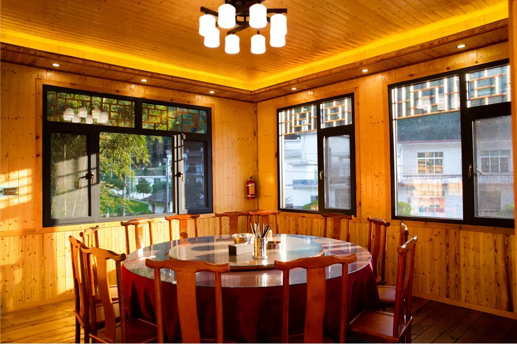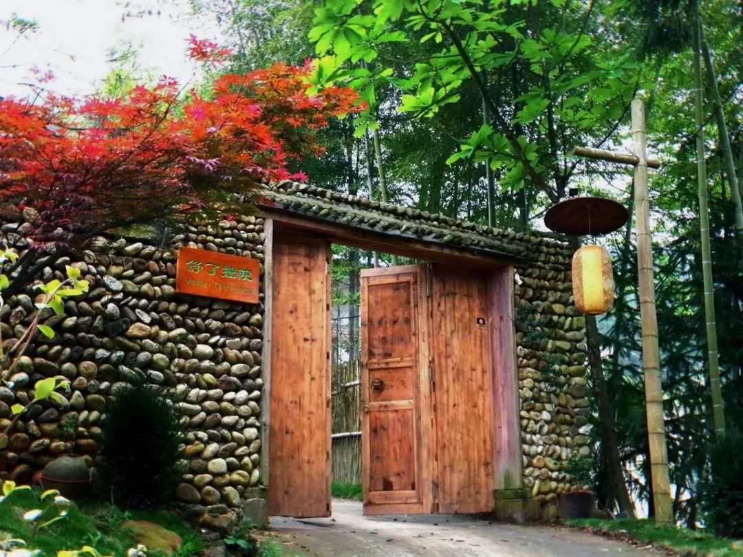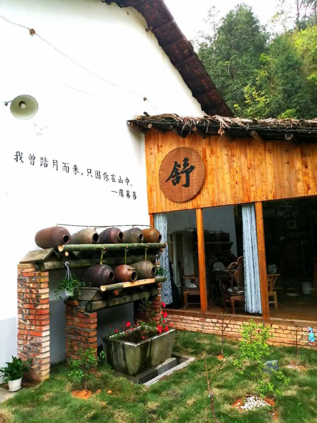 进入新泉乡杨家湾村,一路盘山而上,看到一处陡坡,转而再看见一扇镶嵌在石墙中的木门,红枫绿树相映成趣,旧式灯笼高挂树梢,舒了拙院就到了。老屋保持着原有的风貌,石灰墙、老木头随处可见,房梁上的老瓦,浅黄古朴的灯笼映衬着草编帘子,木梁字画,稍作收拾,就有了不一样的味道。这里有着最地道的农家土菜,最自然的满目葱茏和惬意舒适的住所——山中辰光这样足矣。