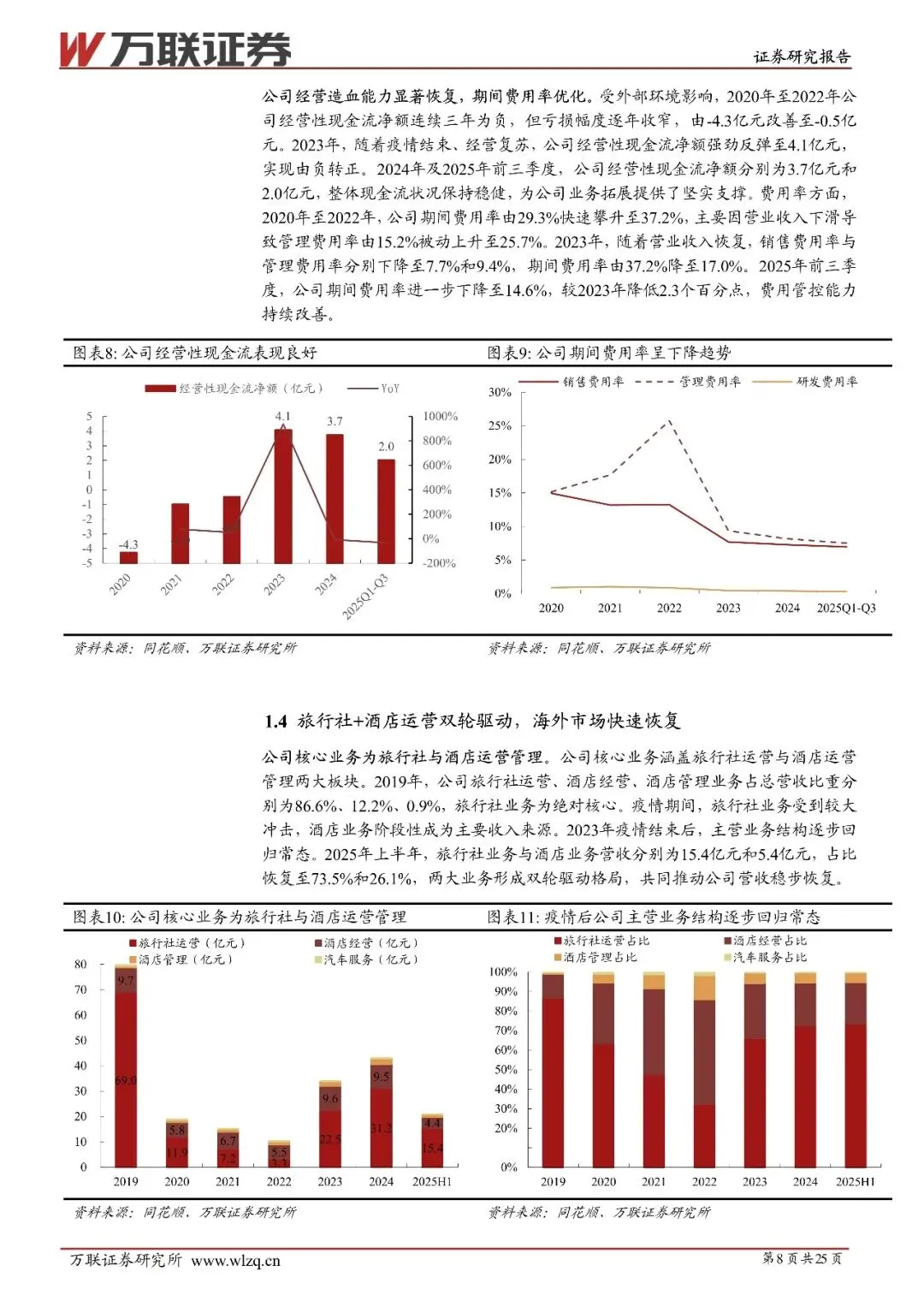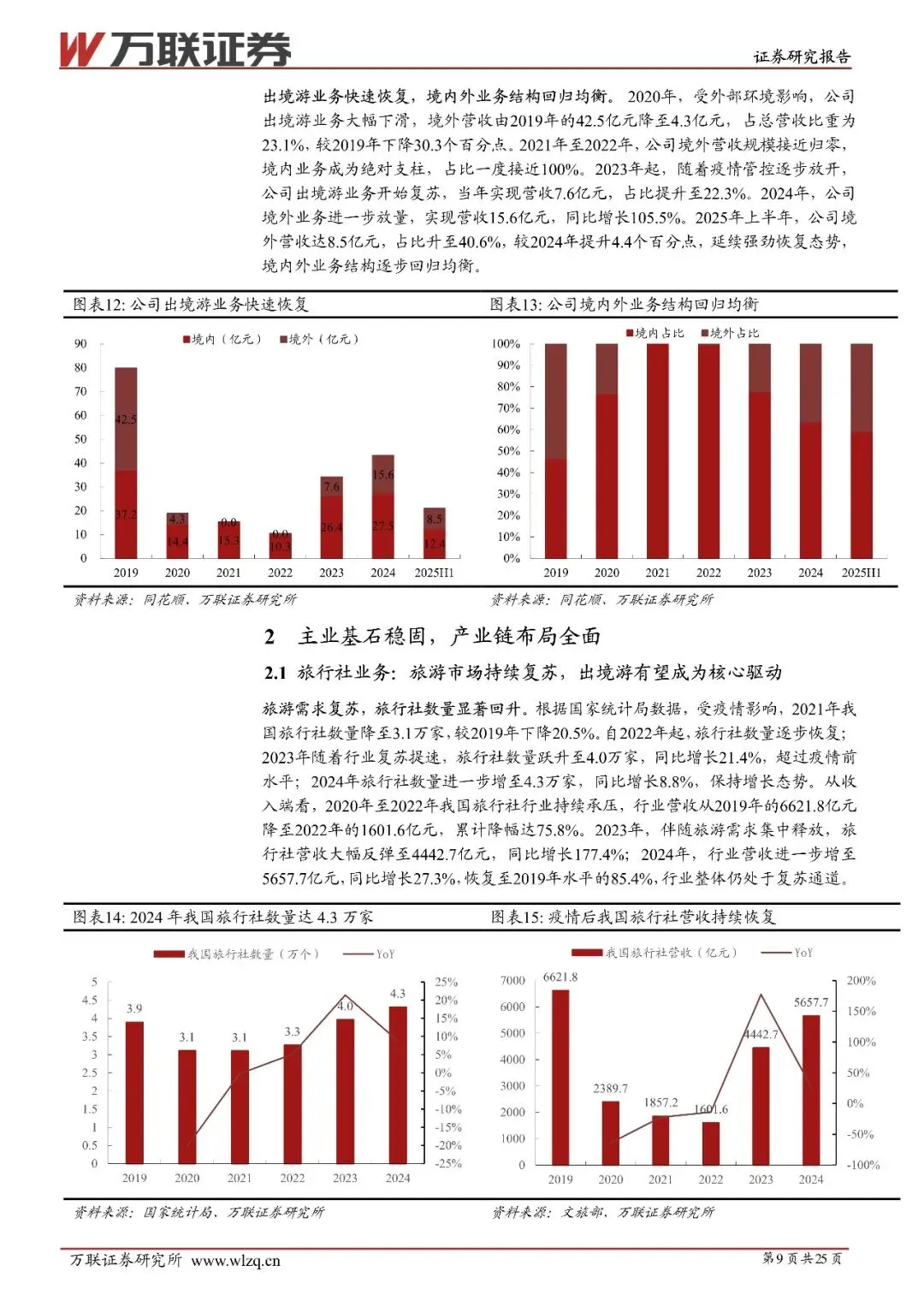 广州市属综合性旅游集团,旅行社+酒店运营双轮駆动:岭南控设前身为东方宾馆,成立于1993年,历经2014年收购岭南国际酒店、2016年重组收购花园酒店、中国大酒店及广之旅等核心资产,转型为集商旅出行、住宿、汽车服务于一体的综合性旅游集团。公司实际控制人为广州市国资委,合计持股62.54%,股权结构稳定,财务方面,2025年前三季度营收34.1亿元,毛利率17.7%维持行业高位。公司核心业务为旅行社与酒店运营,2025年上半年旅行社与酒店业务营收占比分别为73.5%和26.1%,出境游业务快速回升,境外营收占比升至40.6%,境内外业务结构回归均衡。