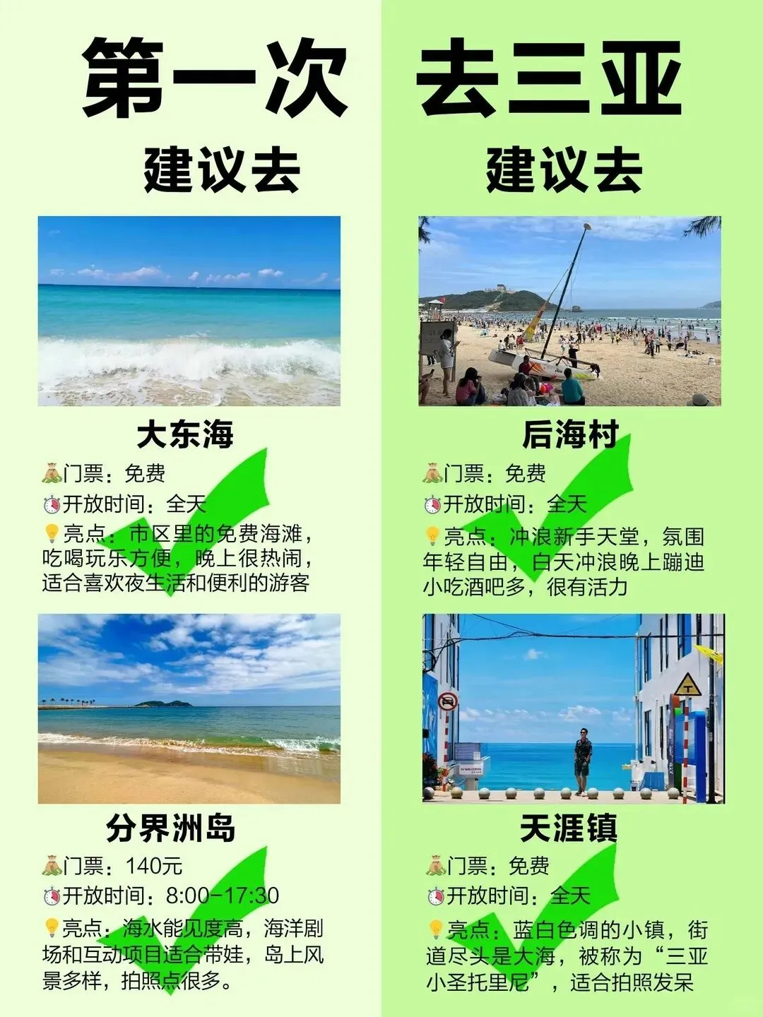🌊 后海村:文艺又松弛的冲浪小镇,烟火气十足。4-6 月水温适合冲浪,新手也能轻松驾驭。白天玩冲浪,晚上逛夜市吃小吃,节奏缓慢又自由,适合喜欢小众、不想去人挤人热门景点的小伙伴。