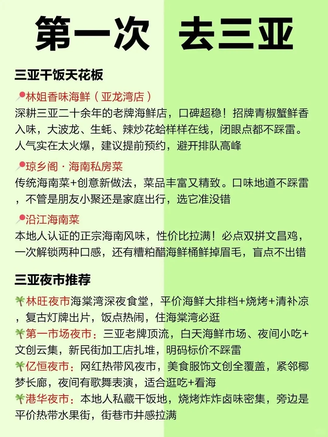 🦞 林姐香味海鲜(亚龙湾店):三亚开了 20 多年的本地老店,口碑在线!海鲜都是现点现杀,新鲜看得见。青椒蟹和大波龙是必点,香辣入味,肉质鲜嫩。饭点人非常多,记得提前预约或错峰去。