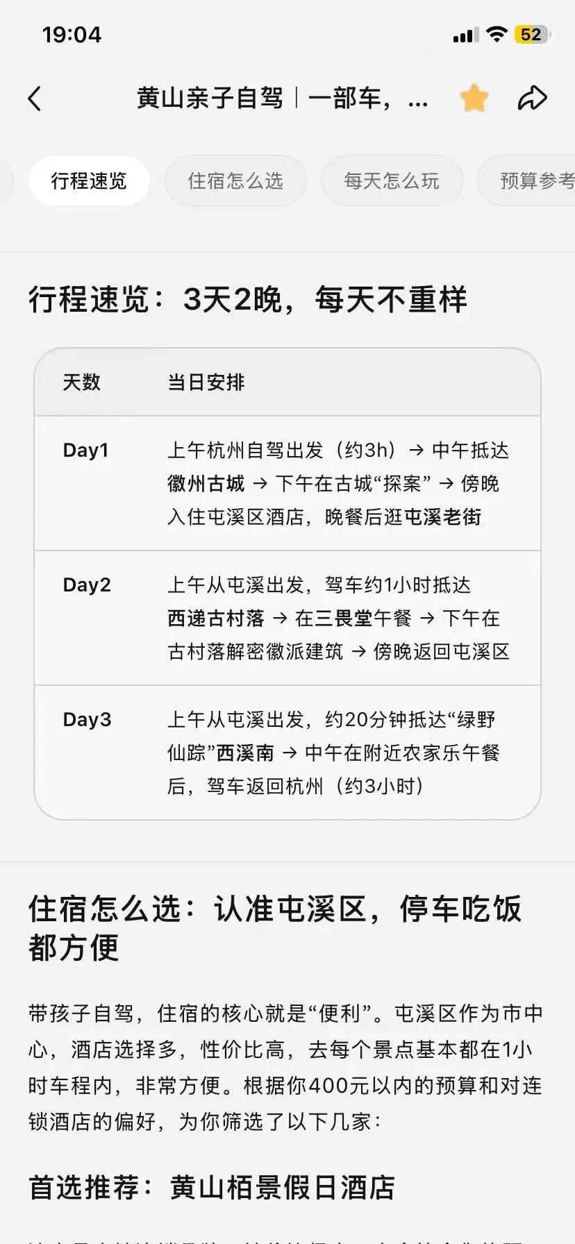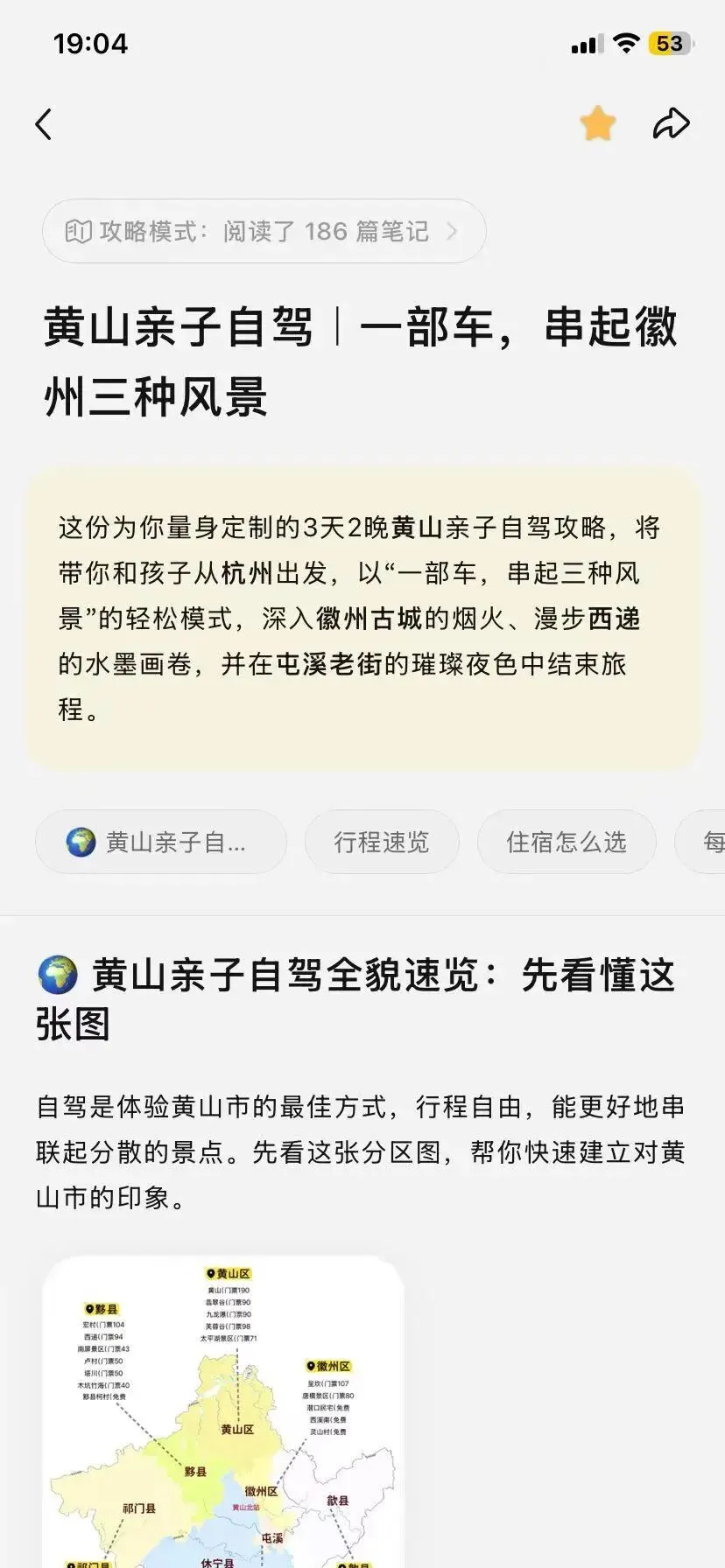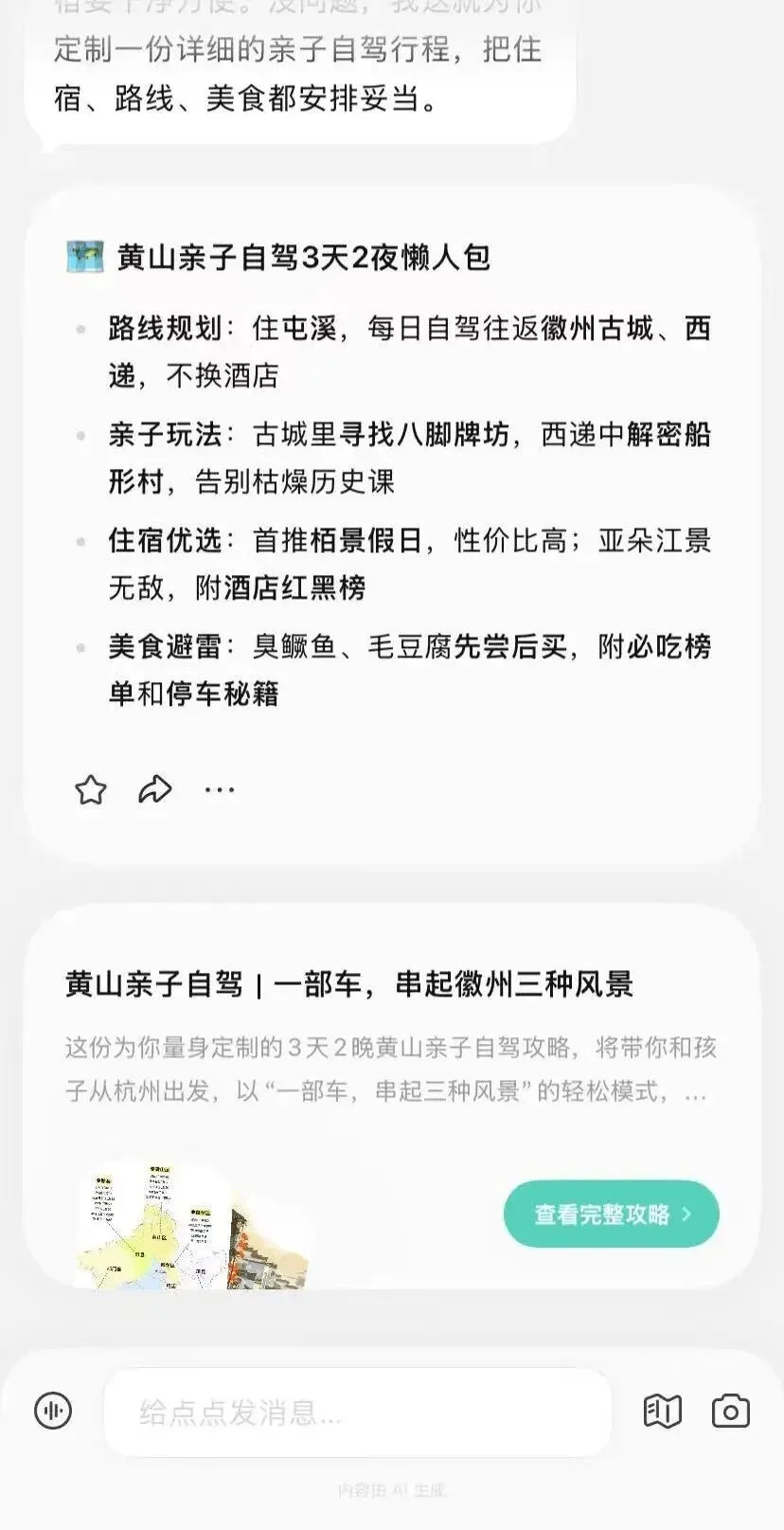 今天我就来专门推荐下它,虽然不是那么神通广大,但有一个功能,是所有平台都望之不可及的。 那就它的旅游攻略!! 五一期间,我打算去一趟安徽黄山市旅游,准备带上小孩自驾前往,我对黄山市不是那么了解,就去小红书搜了搜,帖子太多,我就直接用点点AI问了问。 不问不知道,一问真不错!
