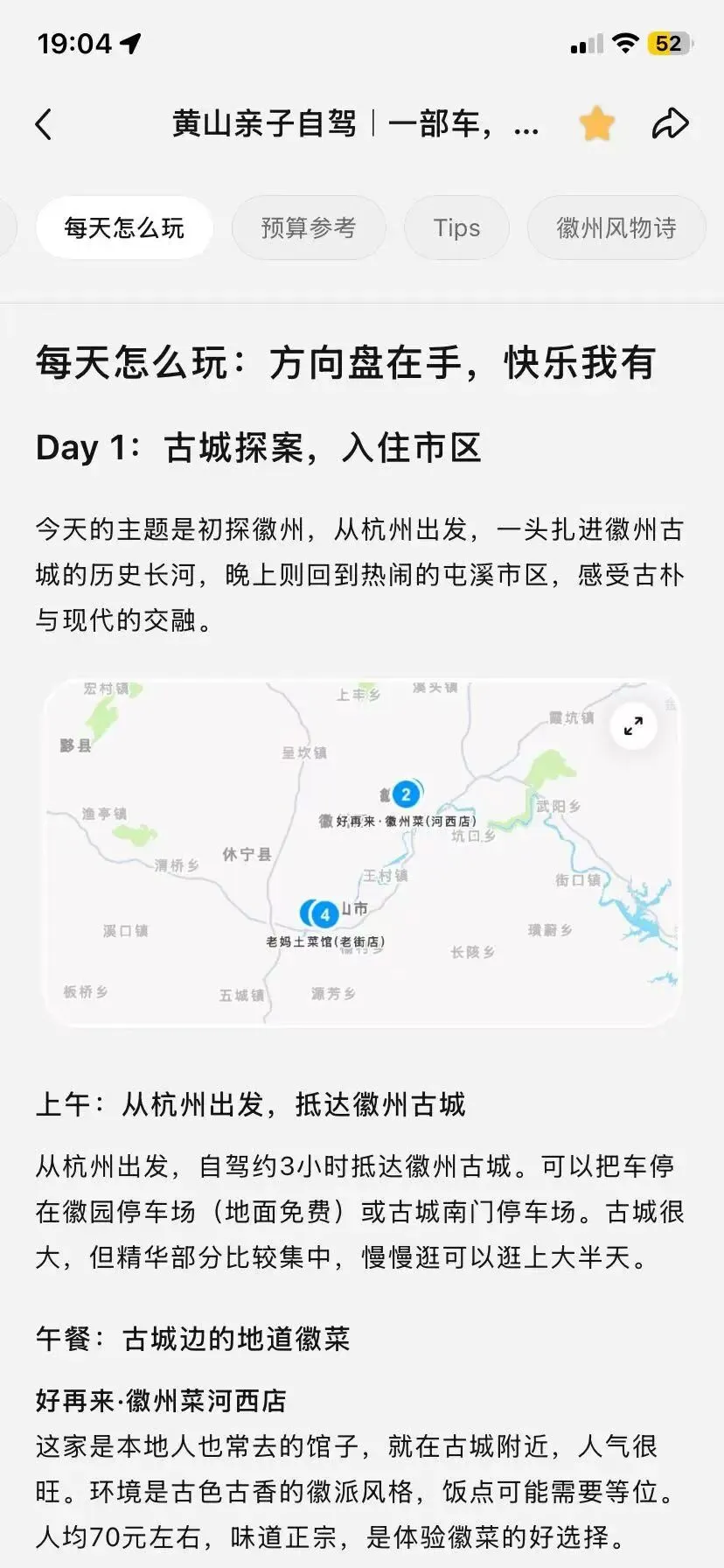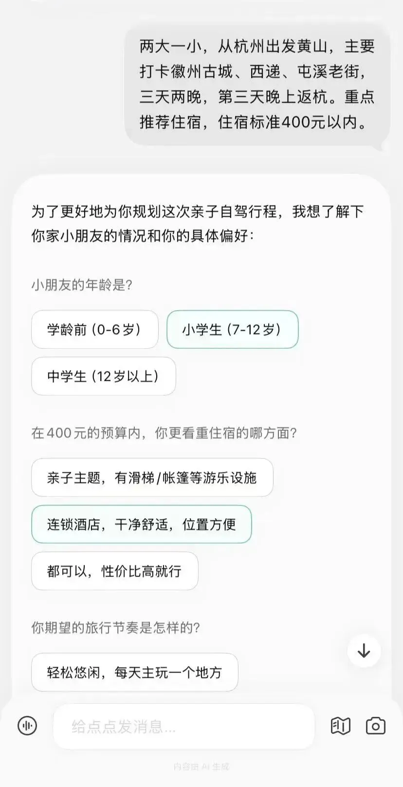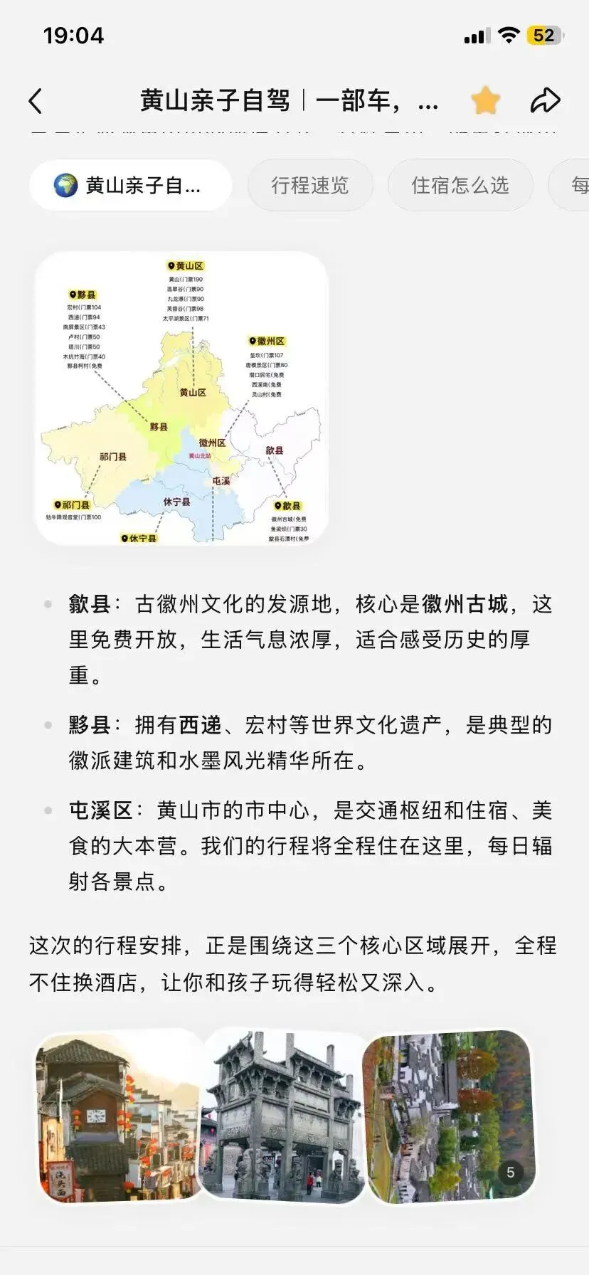 今天我就来专门推荐下它,虽然不是那么神通广大,但有一个功能,是所有平台都望之不可及的。 那就它的旅游攻略!! 五一期间,我打算去一趟安徽黄山市旅游,准备带上小孩自驾前往,我对黄山市不是那么了解,就去小红书搜了搜,帖子太多,我就直接用点点AI问了问。 不问不知道,一问真不错!