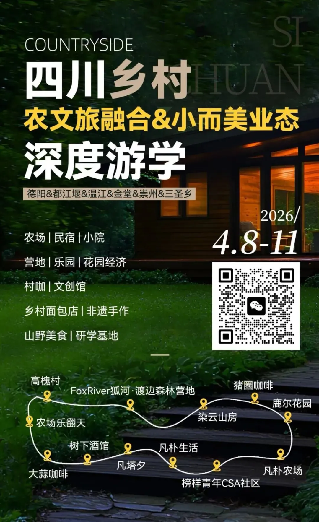 2026年4月8-11 日,我们将到四川深度游学乡村农文旅融合与“小而美,小而精”业态标杆项目: