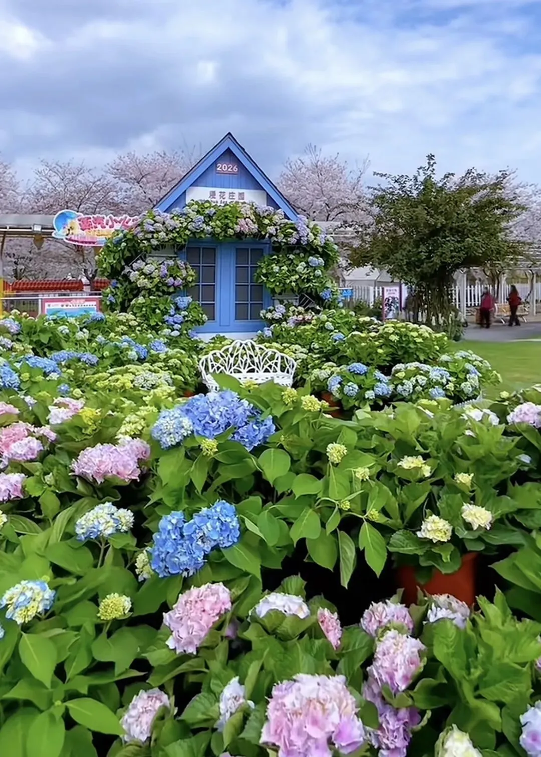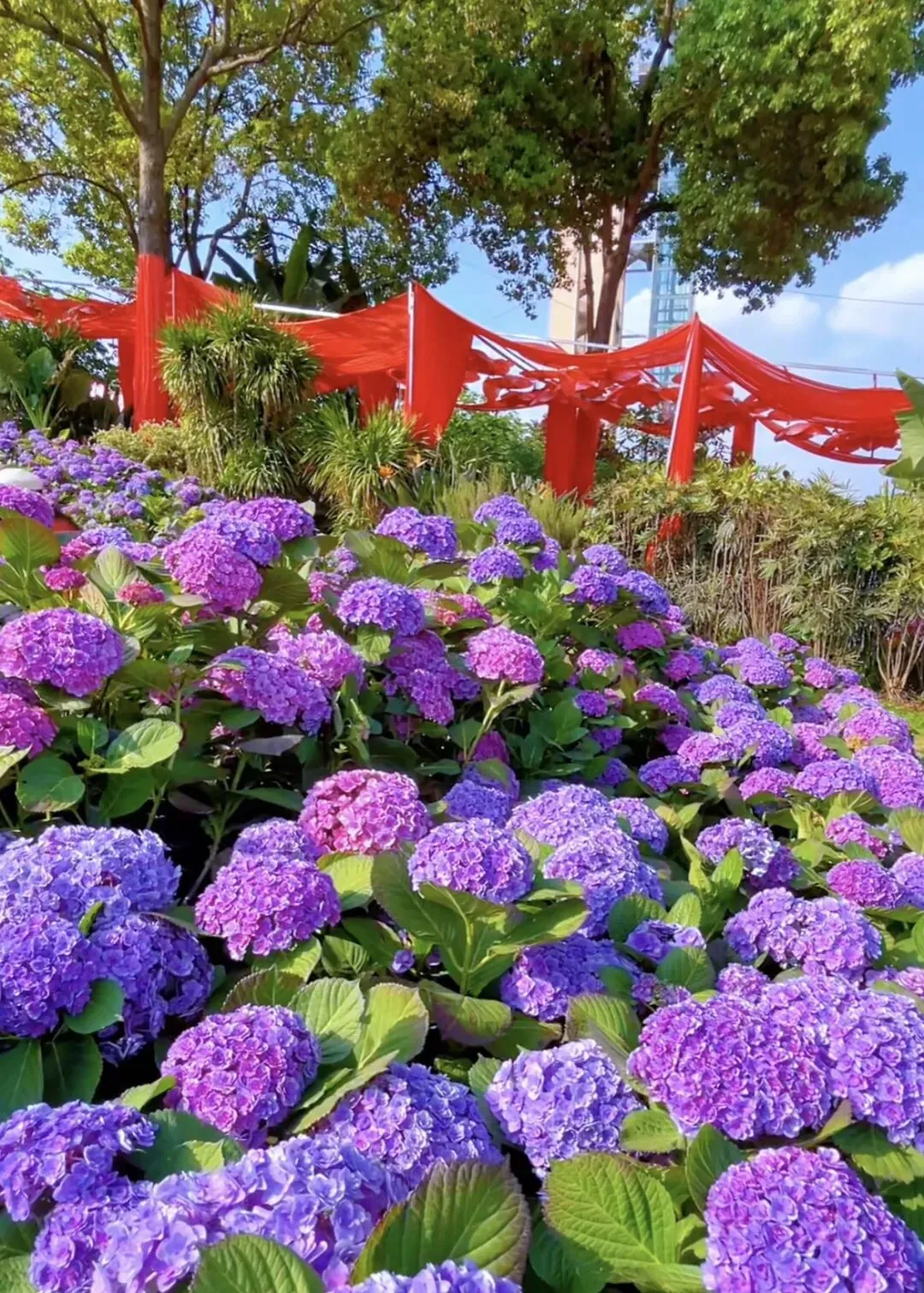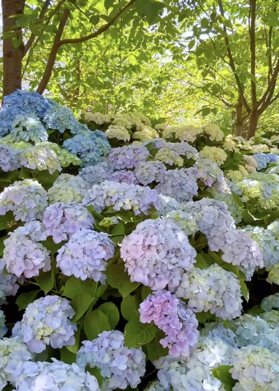 大团大团的淡蓝、粉紫、纯白绣球晕染出温柔的渐变色,如冰淇淋般软fufu地堆在枝头,随手一拍都是春日大片。