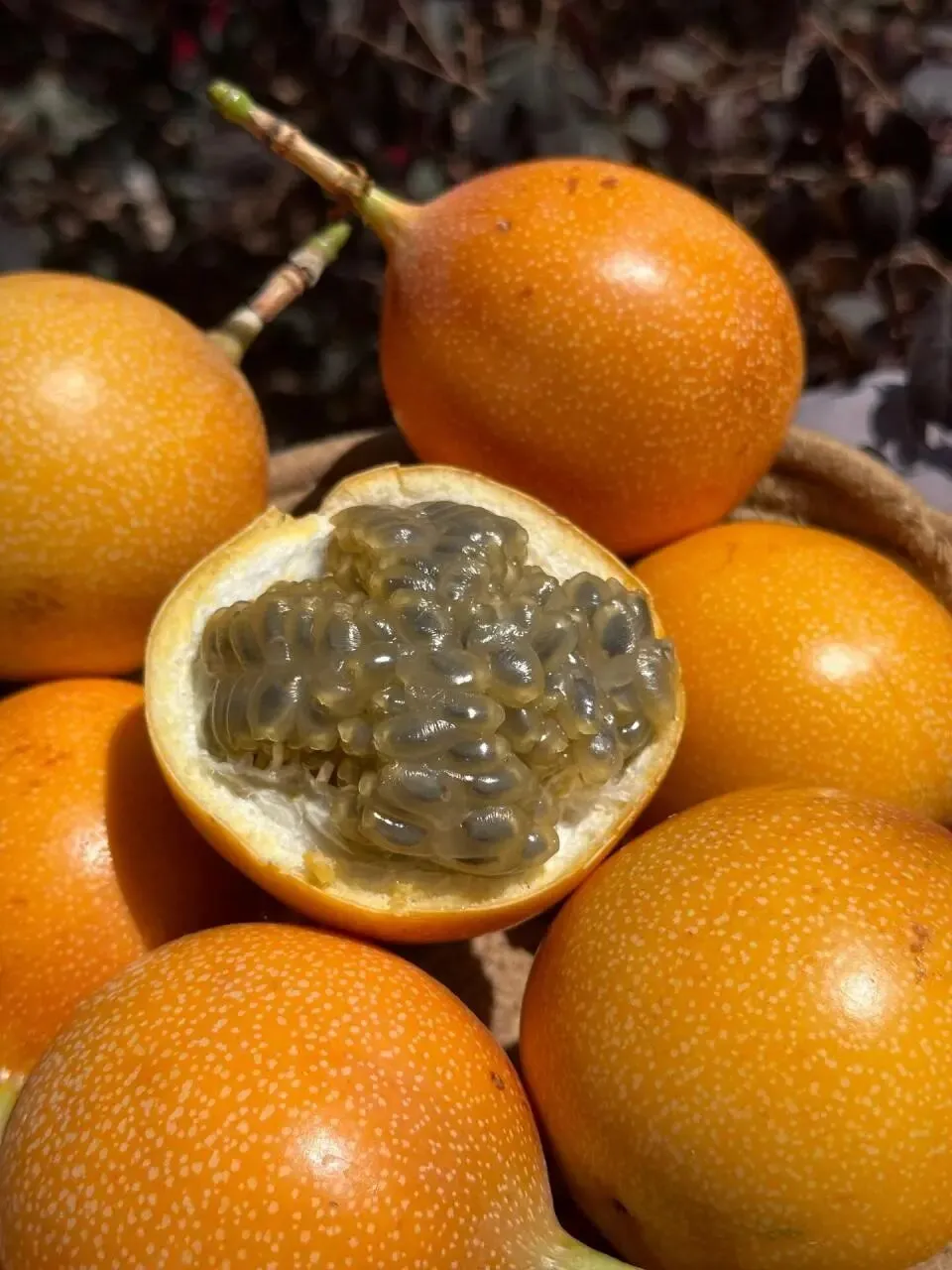 热情果(Passiflora ligularis),又称甜西番莲、Granadilla,属西番莲科,是百香果的“近亲”,但为独立物种。原产南美安第斯山区,现云南、广西为国内主产区。