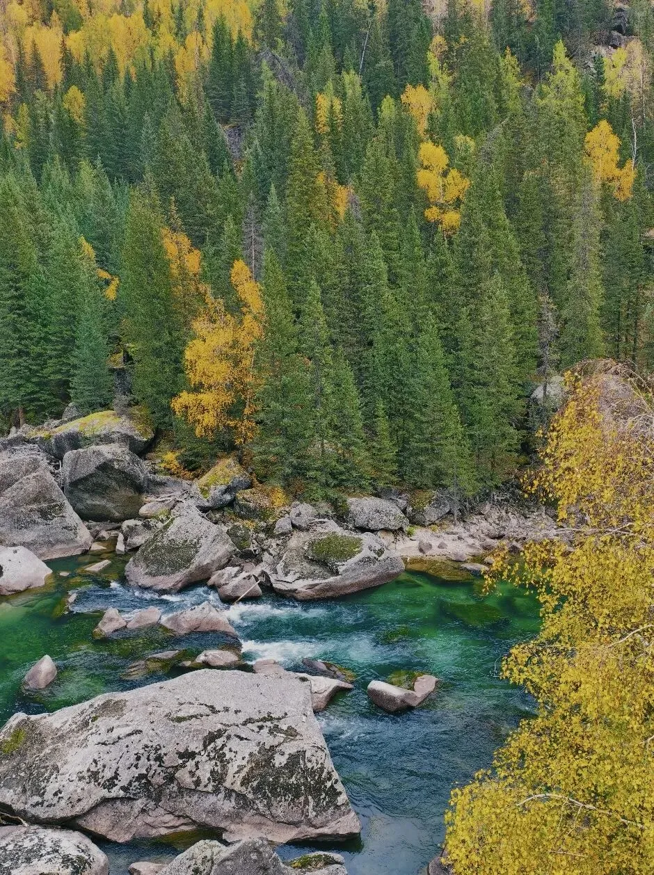 秋天的额尔齐斯河,水蓝得像一匹会发光的绸子。阳光从金叶子缝里漏下来,正好照在神钟山那块大石头上,又暖又亮。顺着峡谷往里走,一路上就听见水在流,脚底下踩着落叶沙沙响,安静得让人心里特别透亮。