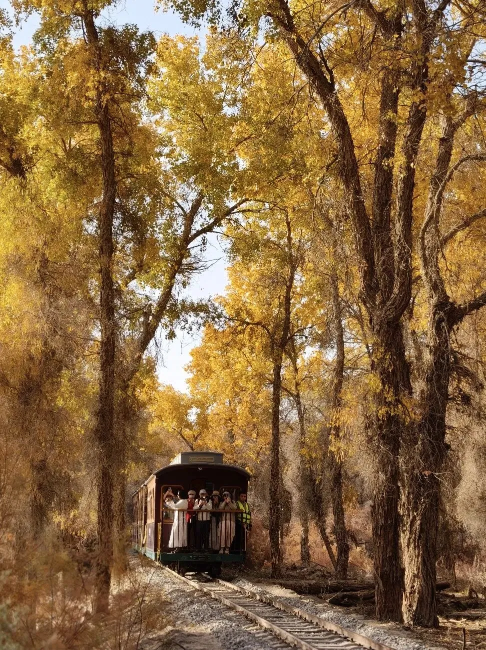 花几十元,跳上哐当作响的复古小火车,驶入无边的金黄。老胡杨姿态倔强,枝干奋力刺向天空,充满生命的张力。