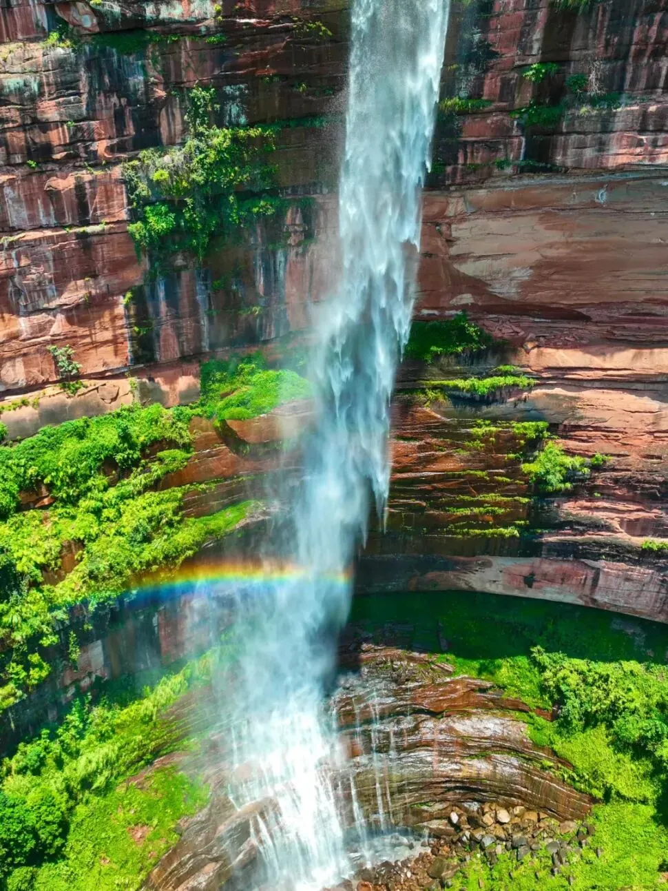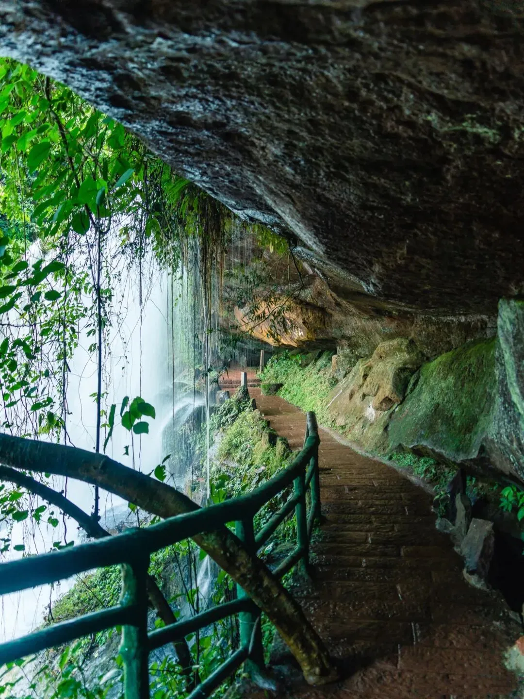 雨水滋润后的丹霞绝壁,红得愈发艳丽,如巨型天幕垂落山间,与脚下的清澈溪流、翠绿竹海、茂密雨林完美交融,构成“四景合一”的独特景观。