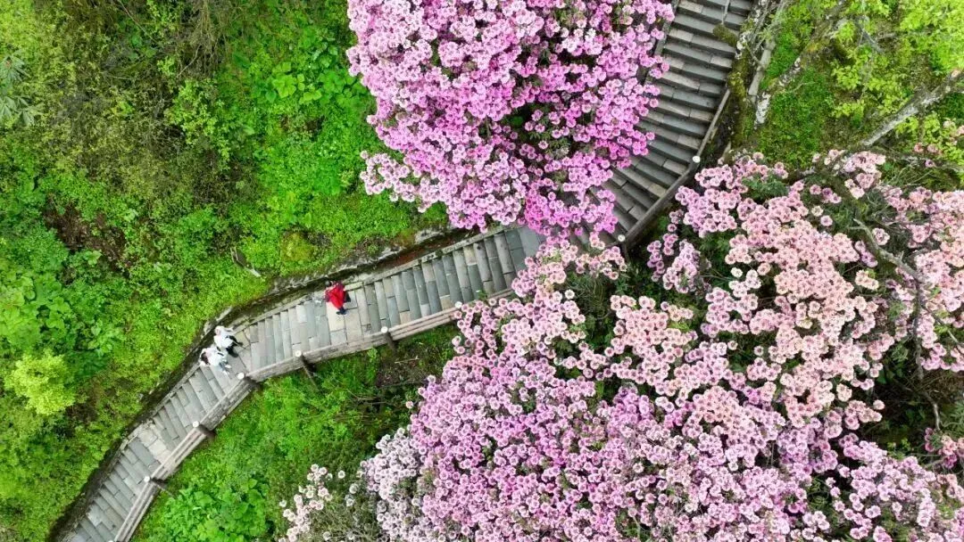 此时的峨眉山,高山杜鹃尚未落幕,漫山遍野的花朵点缀在青山绿树间,粉的、紫的、白的,层层叠叠,与山间的云雾交织在一起,宛如仙境。