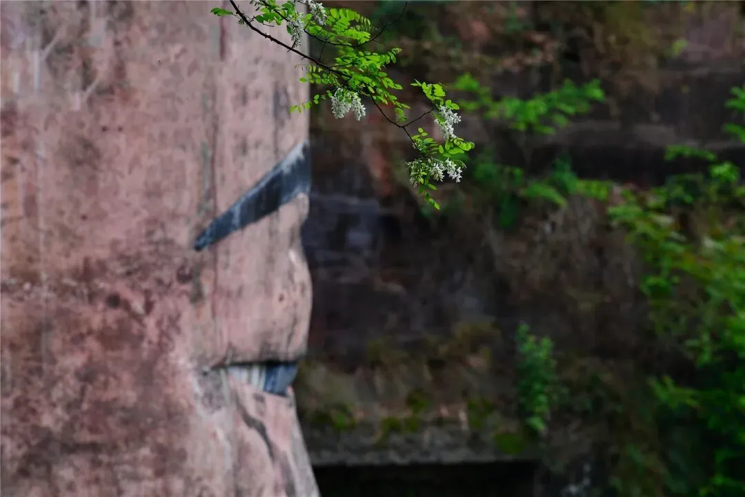 春日的乐山大佛,江水碧波荡漾,两岸绿树成荫,大佛依山而凿,头与山齐,足踏大江,神情肃穆,气势磅礴。