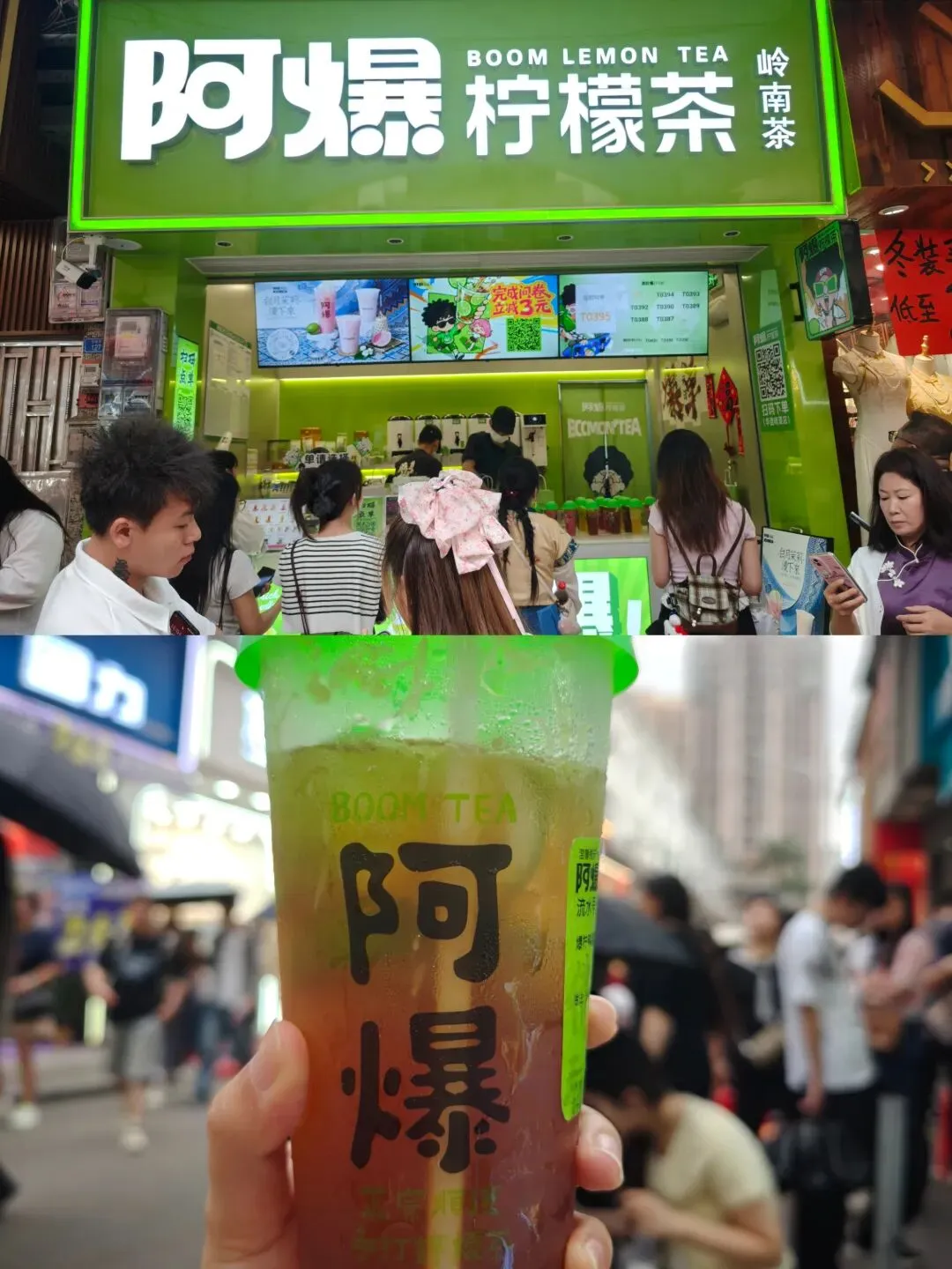 在华盖步行街和金榜街,几乎走几步就能看到有人拿着阿爆柠檬茶,门店更是排起长队。