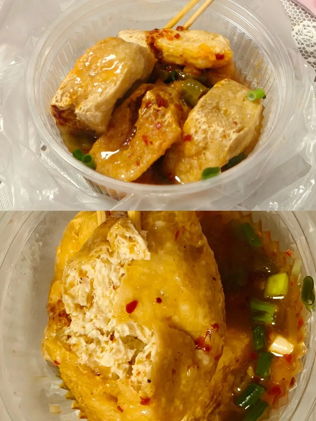 路边随便买的臭豆腐,闻着臭香臭香的,吃起来一般, 汤汁有点咸,但辣椒还不错,6块钱4个,感觉不太划算~