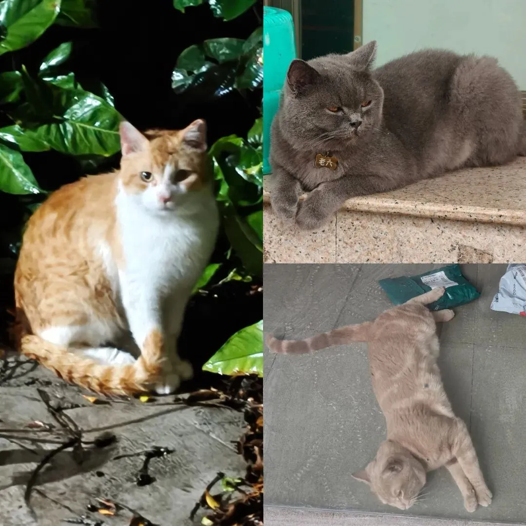 而且猫咪都养得胖乎乎的,连左边那只流浪猫,看起来也十分圆润。
