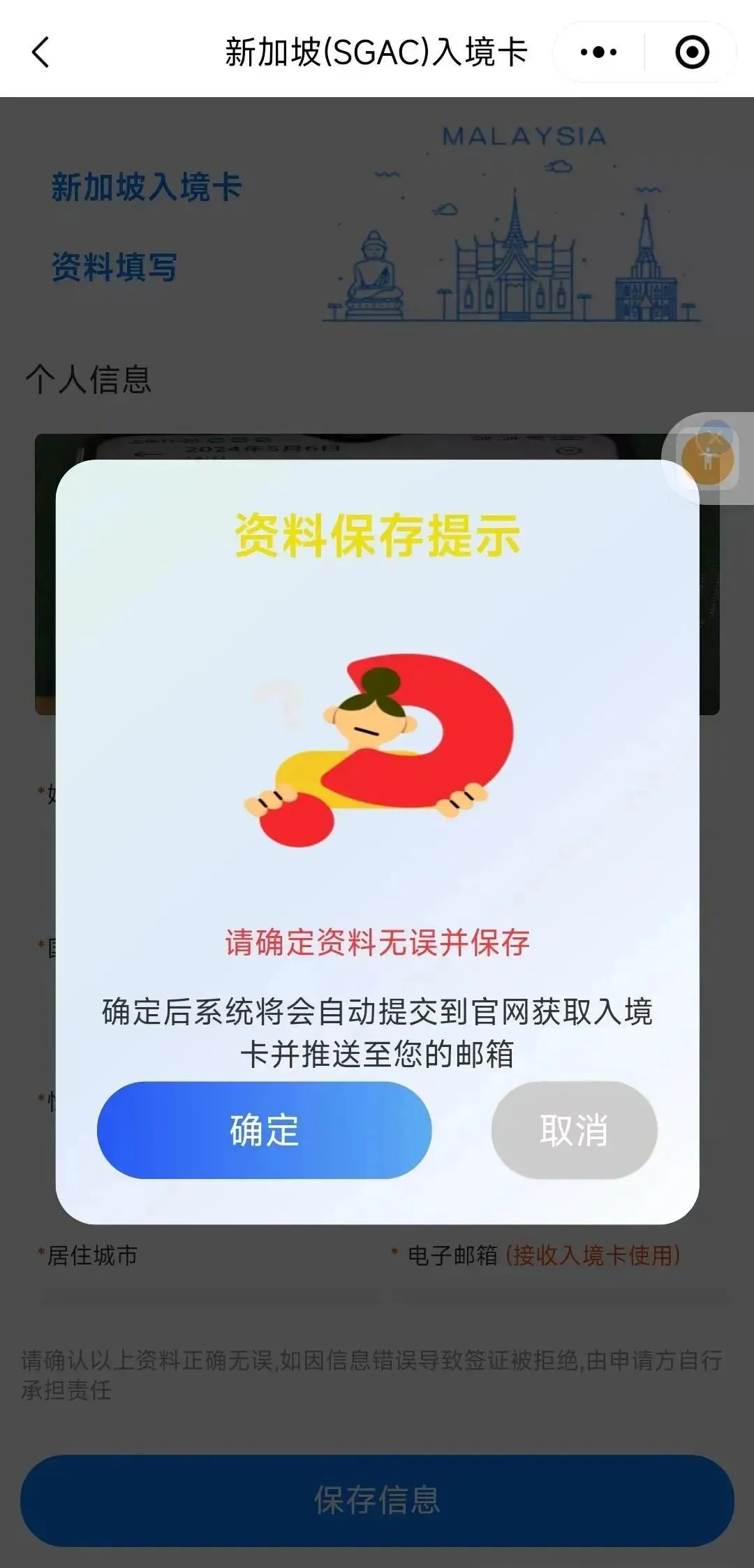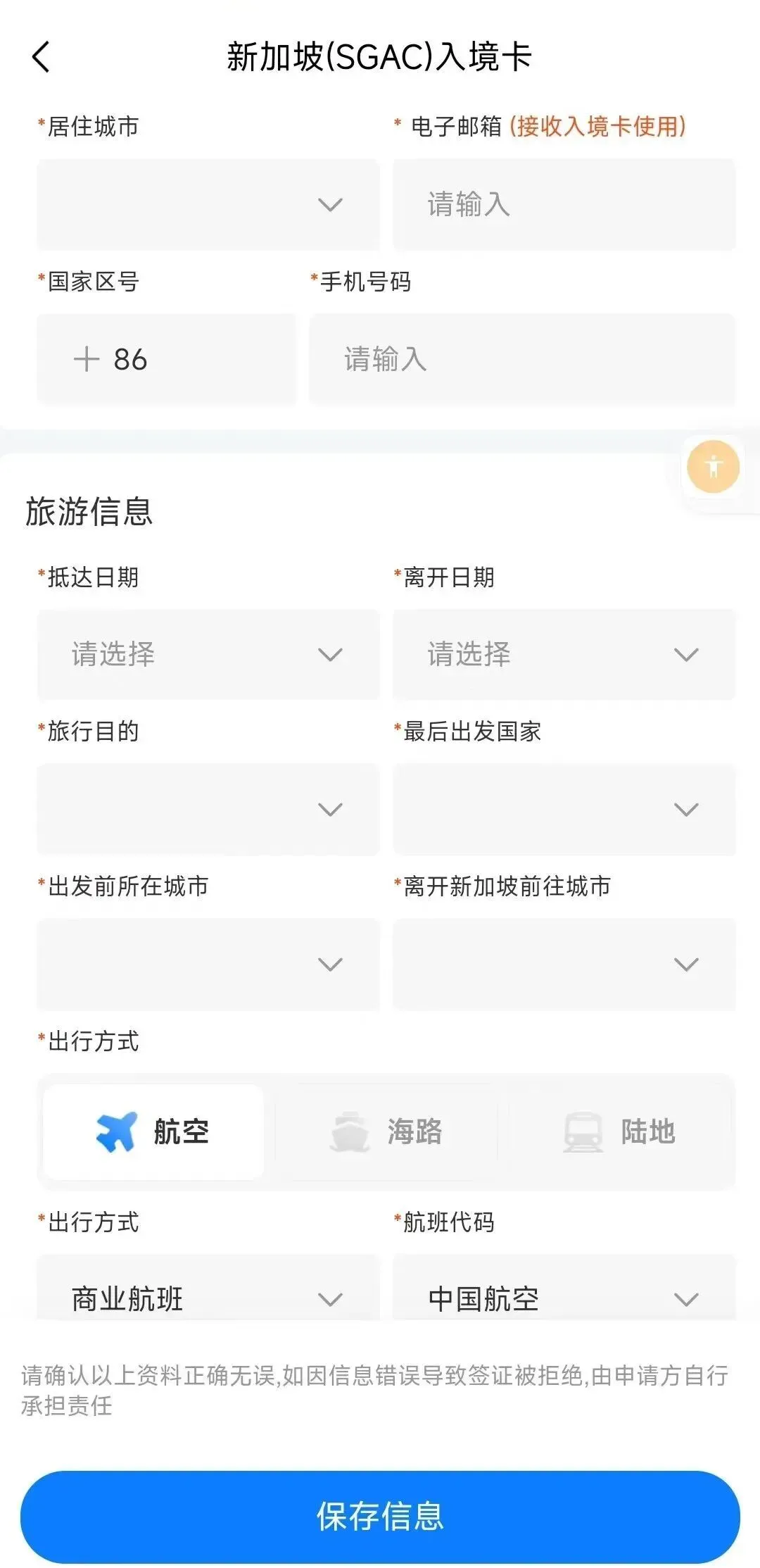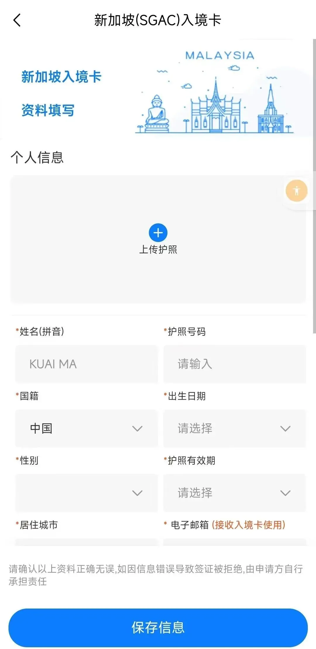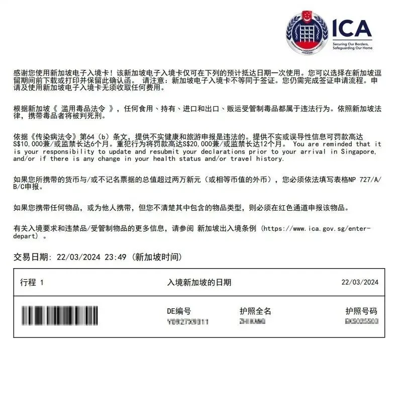 2.新加坡入境卡:所有游客需在入境前3天在线填写,无费用,信息需与护照一致,提交后保存确认凭证备查。
