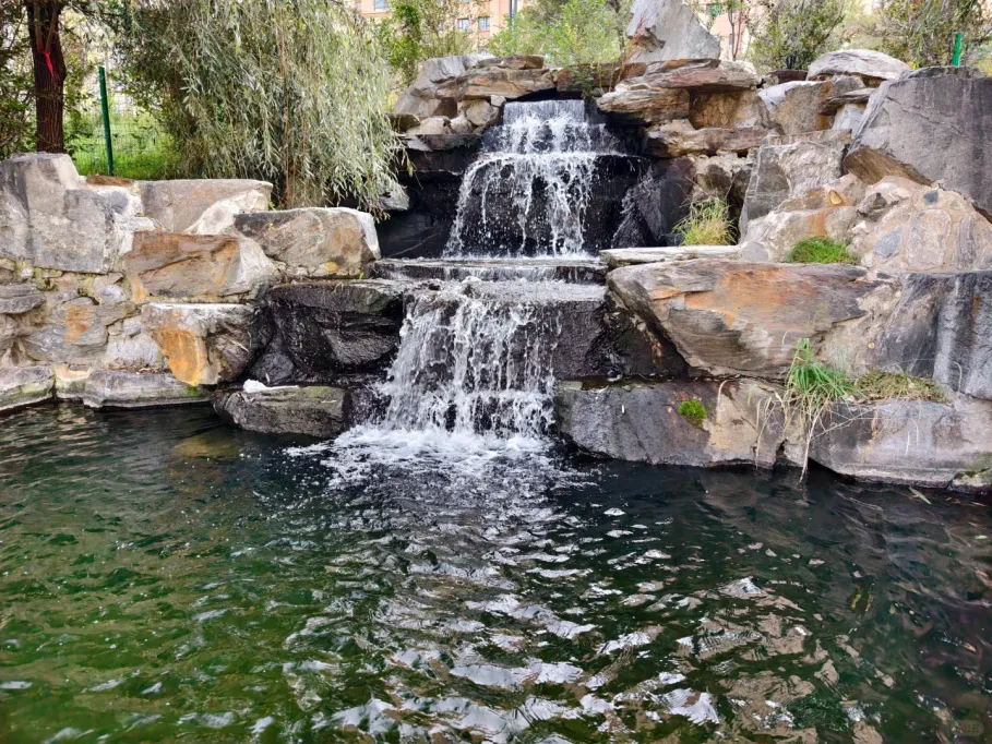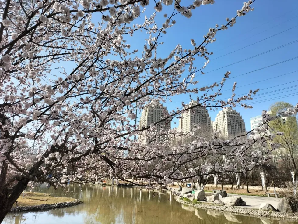 除了郁金香,公园的春日画卷更藏着多重惊喜。人工湖畔,垂柳新绿与湖心山的倒影相映,拱桥边的桃花已悄然染粉;儿童游乐区旁的丁香园,浅紫色花穗正酝酿着馥郁芬芳与绽放的桃花共同构成春日的协奏曲。湖面波光中,偶尔掠过几只野鸭,为花海增添灵动的生机。