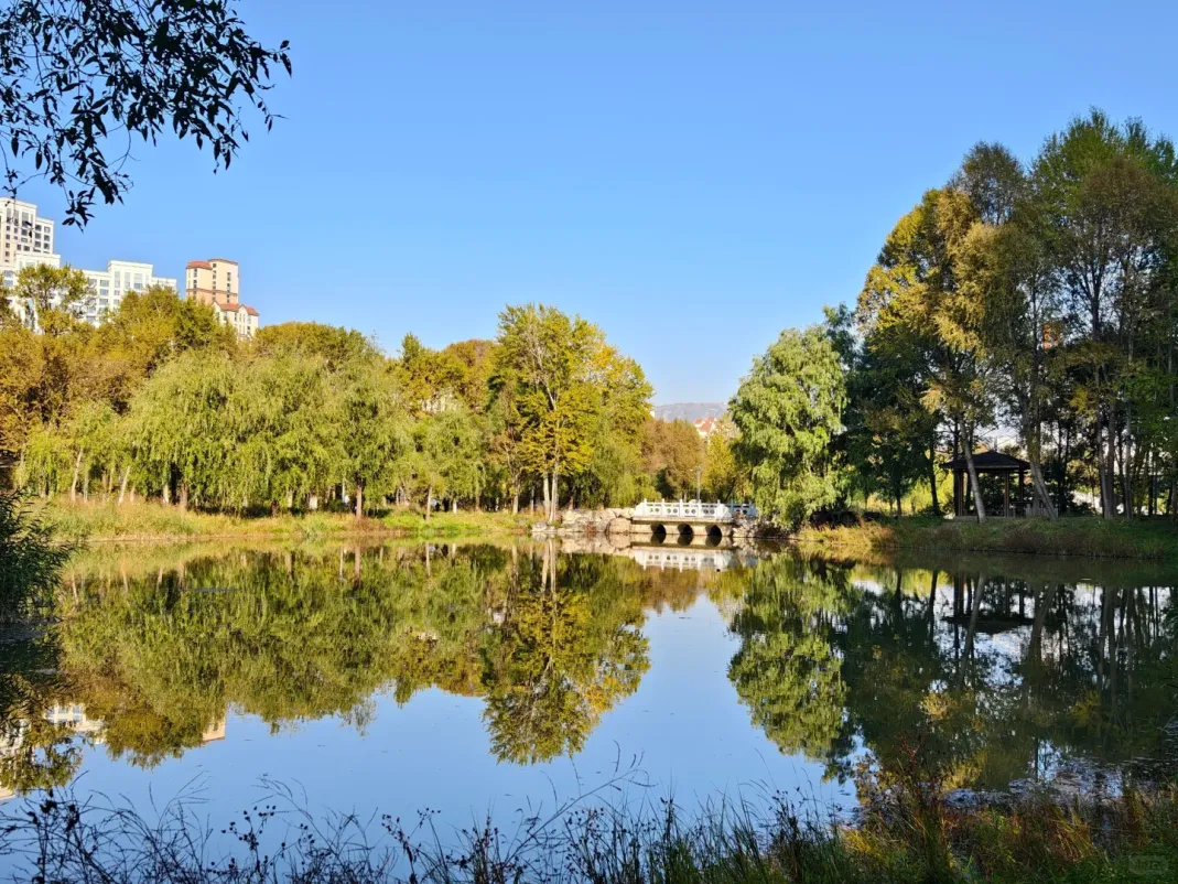 湿地公园湖水如镜,倒映着蓝天白云和周边的山峦以及城市建筑群,形成一幅宁静而迷人的画面。繁茂的植被为各种鸟类和小动物提供了栖息之所,游弋在水面的野鸭子以及不知名水鸟为漫步的游人增添了生机与乐趣。