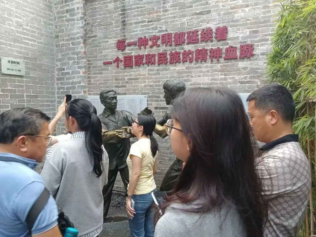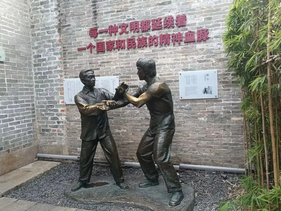 穿行在永庆坊的青石板巷中,我很快找到了永庆一巷13号——一栋青砖黛瓦的西关大屋,门前伫立着一座铜像:李小龙与父亲李海泉过招的场景栩栩如生,父亲出拳凌厉,李小龙则以经典招式格挡,瞬间将人拉回那个功夫片的黄金年代。