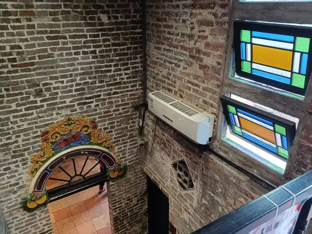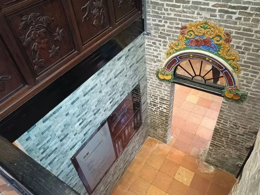 推开趟栊门,典型的三进砖木结构扑面而来。青砖墙、石门夹、雕花大梁,还有彩色雕花玻璃屏风,将岭南民居的雅致藏得恰到好处。阳光从天井洒下来,照亮了正厅高悬的“戏武世家”牌匾,光影在满洲窗的彩色玻璃上晕染开来,仿佛时光在这里放慢了脚步。