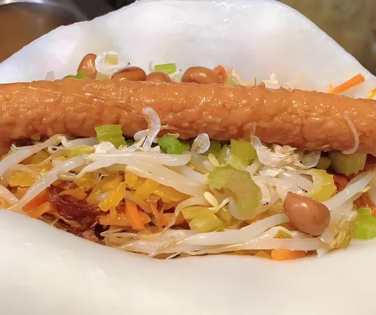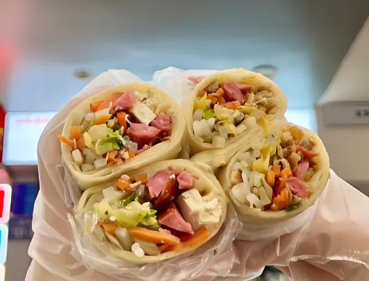 第五美食:食饼筒这是台州人的“满汉全席”。一张薄饼皮,里面卷上十几种菜:炒米面、红烧肉、鸡蛋丝、豆芽、豆腐干……端午节必吃,但现在很多小吃店常年有卖。这不仅是食物,更是一种文化,包罗万象。一个下去,那是把台州的味道都吃进了肚子里。