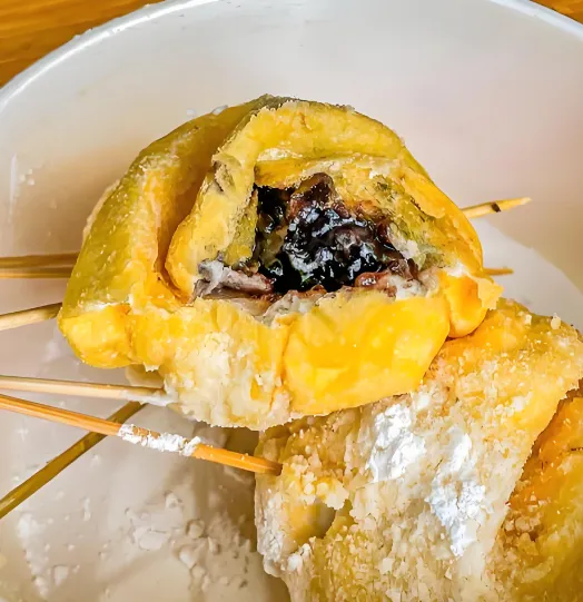第三美食:蛋清羊尾这可是临海的非遗小吃,叫羊尾却没羊。它是用蛋清、豆沙、麦粉做的,油炸之后撒上糖粉,像羊尾巴一样。口感绵软,甜而不腻,还有坚果的香气。紫阳街上有好几家老字号,刚出锅的最好吃,冷了会回缩。这是以前宫廷的点心,现在咱们老百姓也能随便吃。