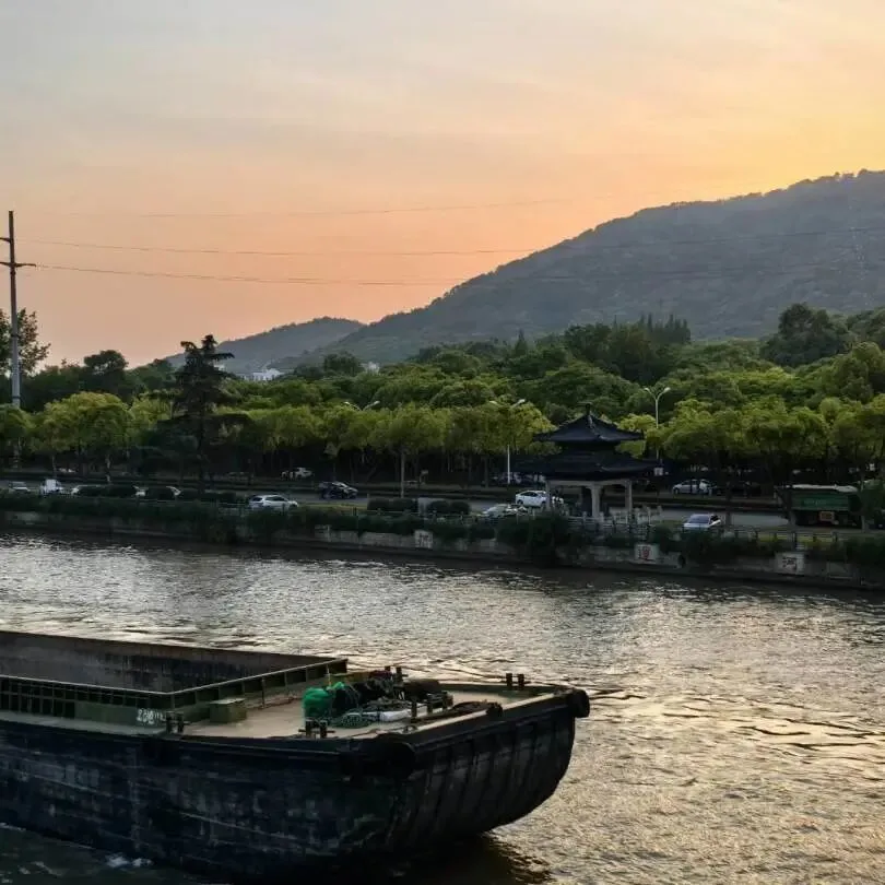 从惠山古镇出来后,人太多不好打车,于是走到附近一个公交车站打车。沿途刚好路过接近日落时分的京杭大运河,那天感觉自己和家人还是蛮幸运的。
