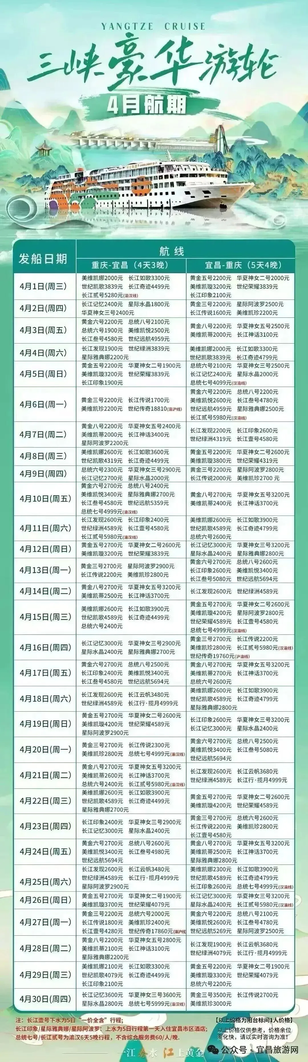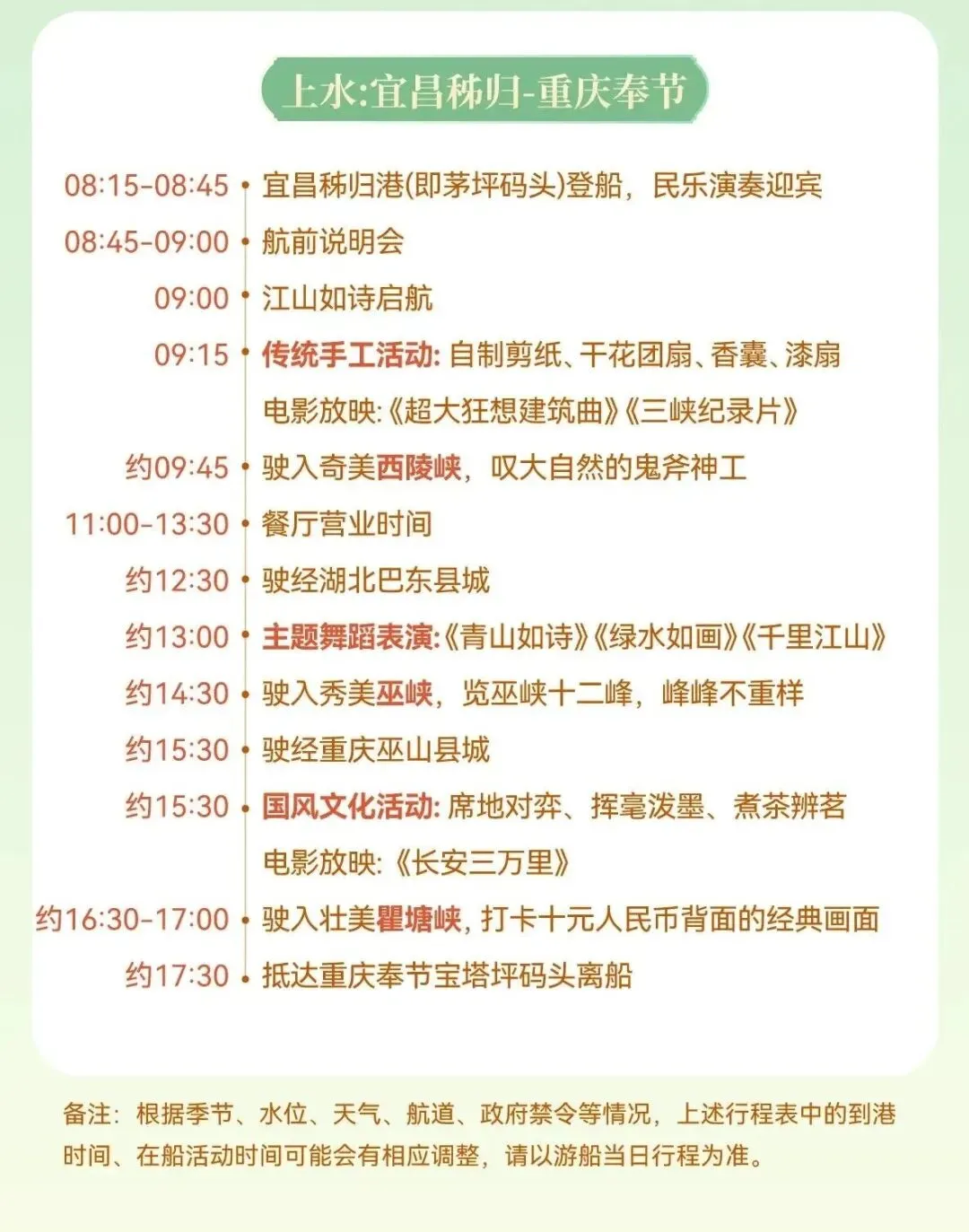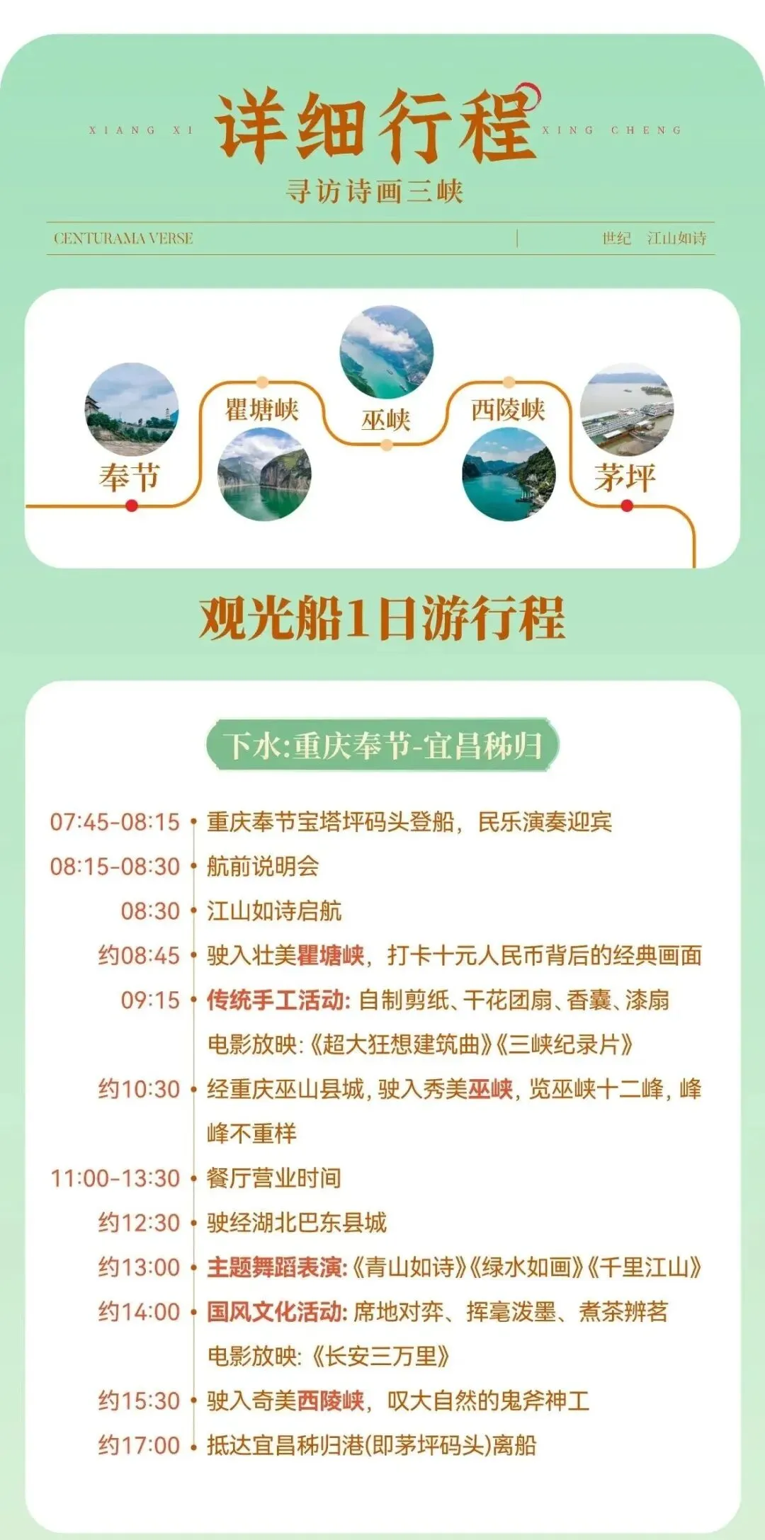 1、世纪江山如诗游轮有固定班期,每周一三五从奉节到宜昌,每周二四六从宜昌到奉节,五一黄金周也不例外,以上攻略按照游轮的固定班期搭配,前后时间调整后会影响正常出行!