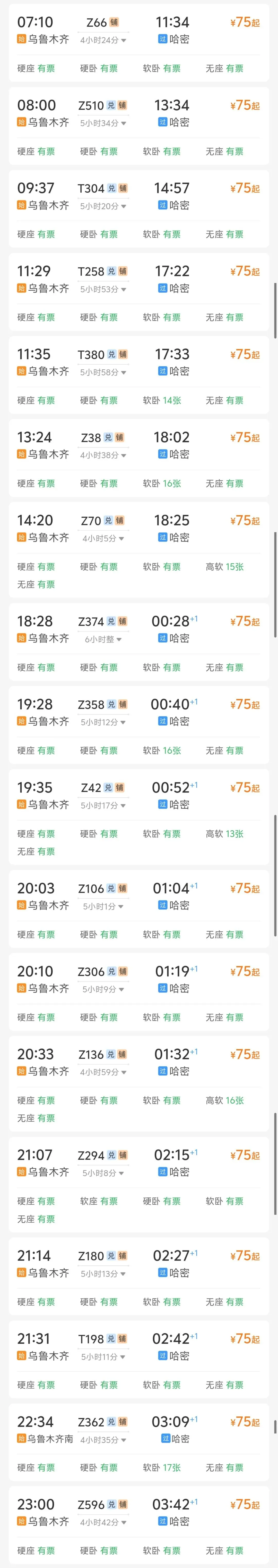 硬座票价低至75元