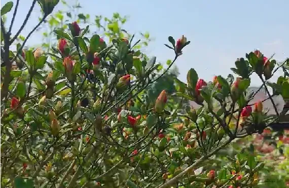漫山杜鹃枝头,饱满的花骨朵层层叠叠、蓄势待发,在春风里静静蓄力,只待时机成熟,便绽放成一片火红云霞。