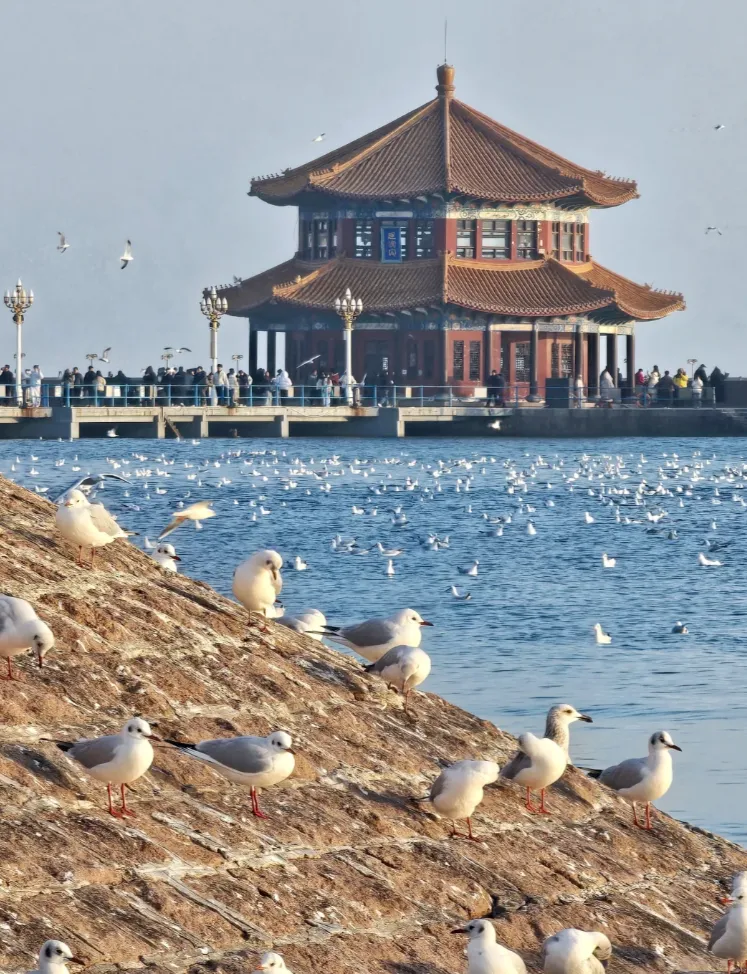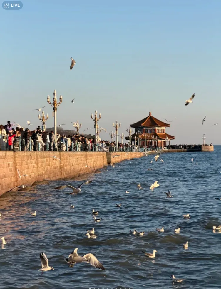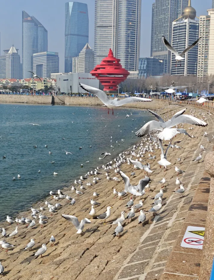 游玩特色:四月栈桥最值得做的事,是喂海鸥!每年冬天到次年四月,成千上万只红嘴鸥从西伯利亚飞来过冬,站在桥边伸手举着面包,海鸥就敢凑过来叼,胆子大的还能拍到跟海鸥“亲密接触”的照片。栈桥24小时开放,想看日落的话,傍晚五六点去,光线柔得不行。人最多的是白天,想清静点就早上去。