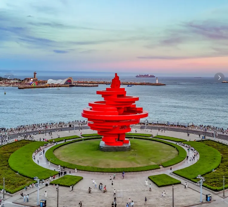 五四广场在市政府对面,中央矗立着那个标志性的红色雕塑“五月的风”,像一团熊熊燃烧的火,寓意五四运动的爱国精神。广场往东就是奥帆中心,2008年奥运会的帆船比赛就在这里办的。
