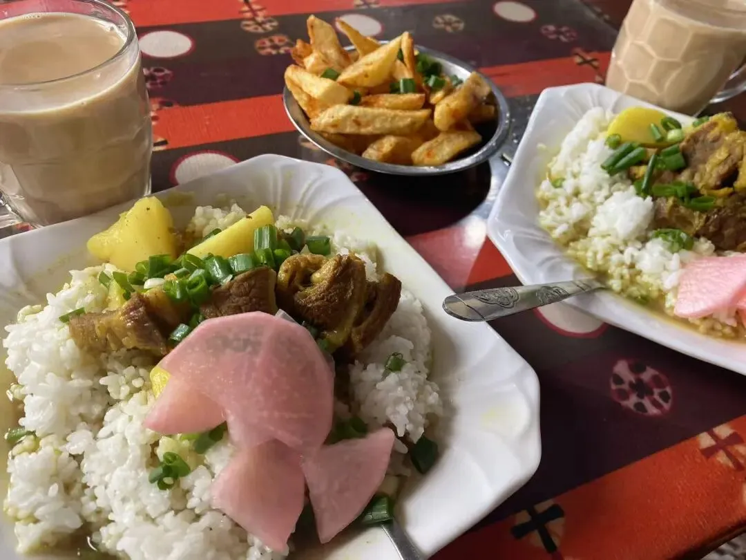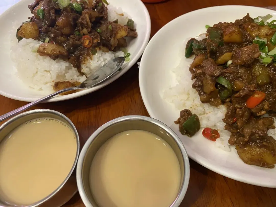 菜品:咖喱牛肉饭+炸土豆+甜茶