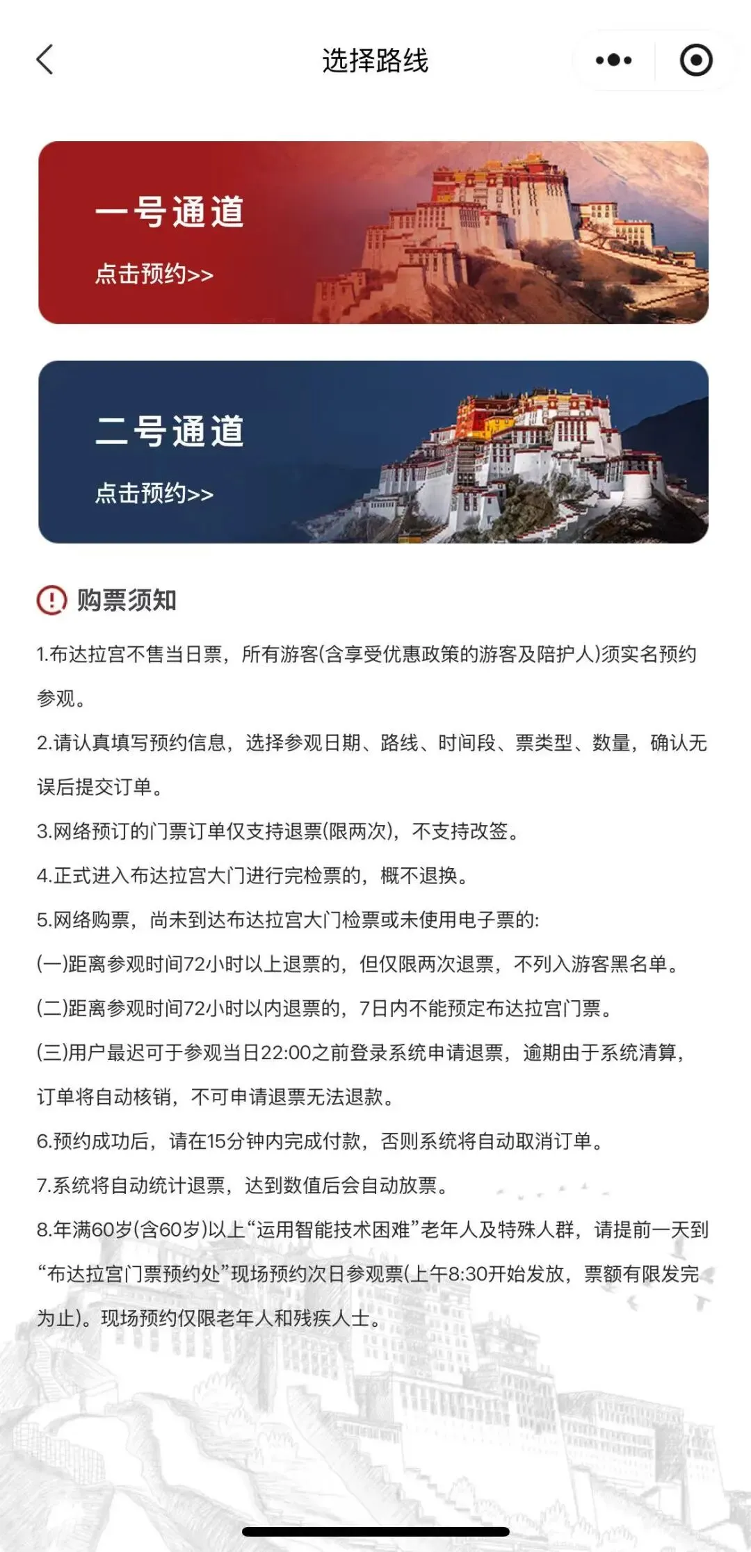 年满60岁(含60岁)以上“运用智能技术困难”老年人及特殊人群,请提前一天到“布达拉宫门票预约处”现场预约次日参观票(上午8:30开始发放,票额有限发完为止)。现场预约仅限老年人和残疾人士。