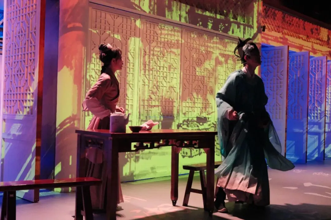 文化园内重点推出的文旅演艺《花开·江天暮雪》以潇湘八景之江天暮雪画卷中的历史脉络作为叙事轴,讲述探寻画中蓑笠翁的故事。通过《序·山墙入境》《前庭探秘》《书院思辨》《夜宴》《乐坊笙歌》五个戏剧微剧场,演绎了苏轼、秦观、米芾、朱熹、张栻等人与湖南的情缘,以及在湖湘文化中的贡献。游客在这里可以体验到沉浸式的宋韵文化,享受一场穿越时空的文艺之旅。