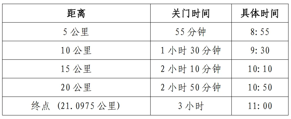 为了保证参赛选手比赛安全,限时对社会交通进行滚动封闭。比赛路线各段专设了赛事关门时间,到了关门时间,相应公里点的计时地毯停止工作,相应路段将恢复社会交通。在规定关门时间内,未跑完对应距离的参赛选手须立即停止比赛,退出赛道,以免发生危险。退出比赛的选手等候组委会提供的收容车或选乘公共交通抵达终点。关门距离和时间以发枪后自然时间计算,具体见下表: