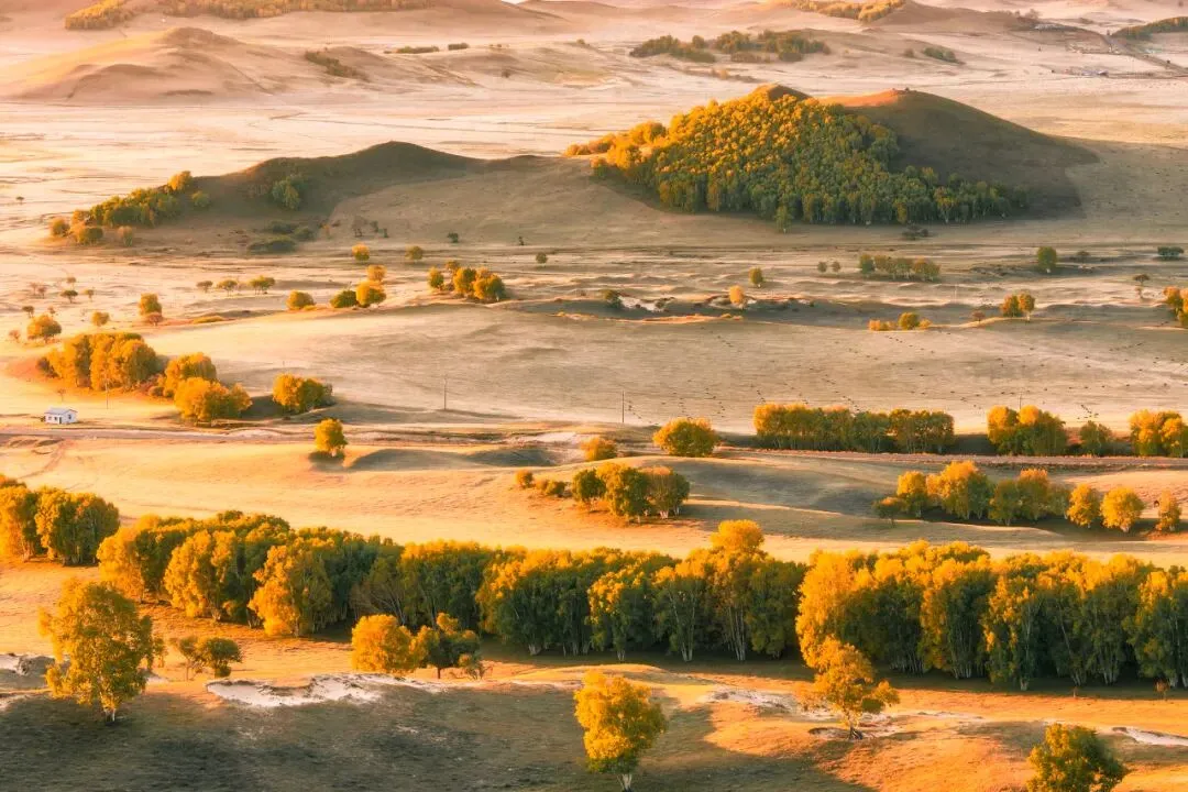内蒙草原的碧绿褪去,裹上一片金黄;