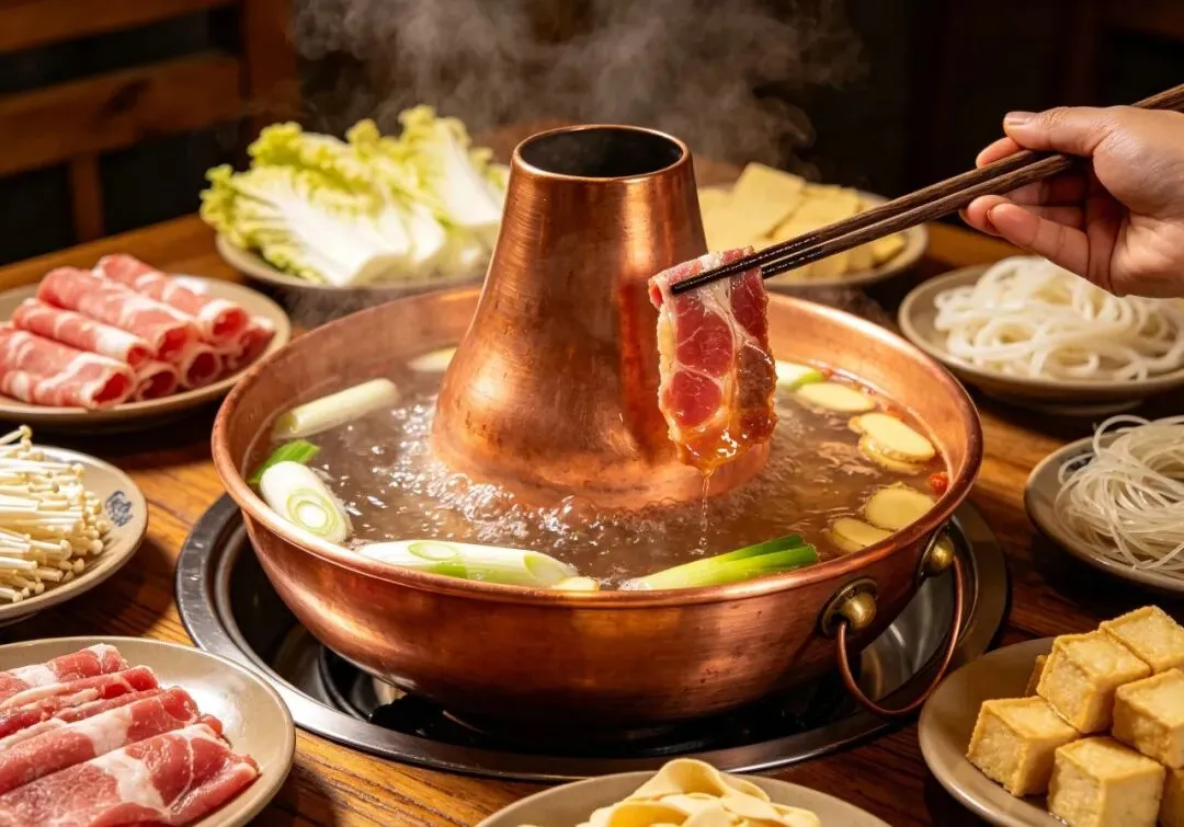 铜锅涮肉:聚宝源、南门涮肉,老北京清汤锅底,蘸麻酱,配上糖蒜,吃得暖乎乎特别满足