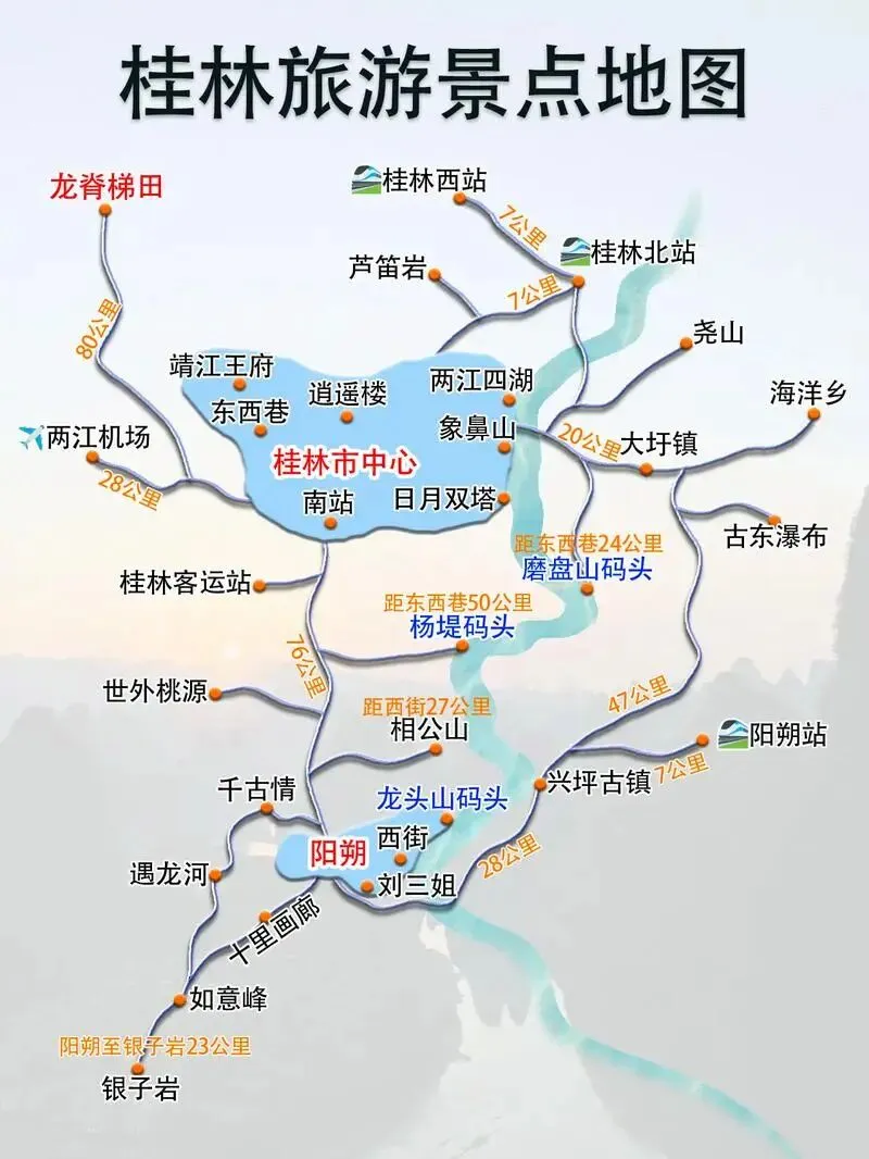机场大巴:直达市区(桂林站、北站方向),车程约50分钟,票价20元。