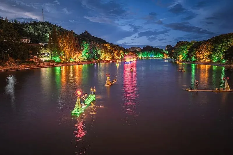 两江四湖是桂林的城市名片,由漓江、桃花江和榕湖、杉湖、桂湖、木龙湖贯通而成,把桂林市中心的所有景点串在了一起,白天是江南水乡的温婉,晚上灯光亮起,就是现实版的“千与千寻”。