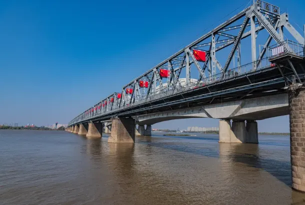 见证城市变 迁的工业风打卡地!原中东铁路第一桥,铁架结构超级出片,傍晚既能拍蓝天白云,又能等江边绝美日落。桥上有玻璃观景台,桥下文艺长廊配暖黄灯光,冬季氛围感堪比《情书》电影场景。