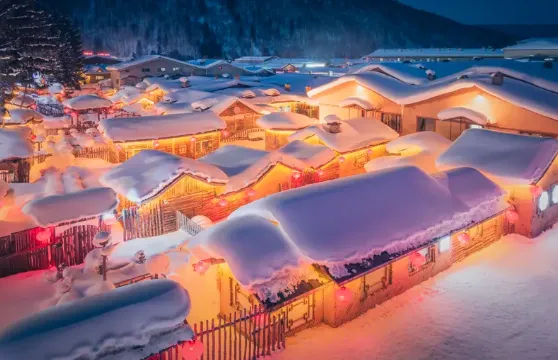 童话世界本界!每年10月至次年4月雪期长达7个月,粘性极高的雪裹在房顶、树枝上,像铺了层棉花糖。夜晚红灯笼亮起,暖光映着白雪,视觉冲击超强;还能体验东北火炕,听着风雪声入眠超惬意。