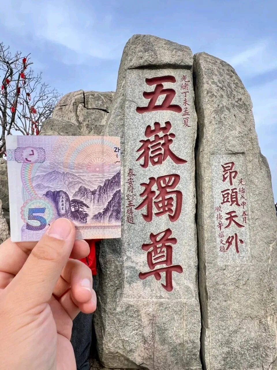 1. 手持5元纸币,背靠五岳独尊石刻拍摄,彰显登山豪情
