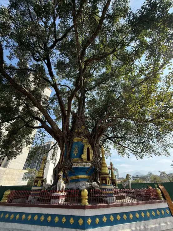 树包塔是芒市最奇特的景点,不是“塔”,也不是“树”,而是树与塔的生死相依。树包塔建于清乾隆五十三年(1769年)左右,是芒市土司为纪念一场战争胜利而建。塔高约10米,呈八角形,为实心砖塔。后来一粒菩提树种子被鸟带到塔缝里,生根发芽,两百年间越长越大,树根紧紧包住塔身,形成了今天的奇观。