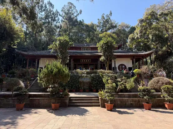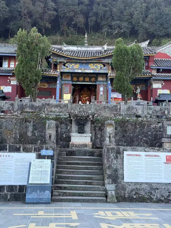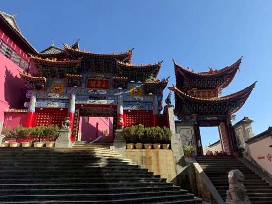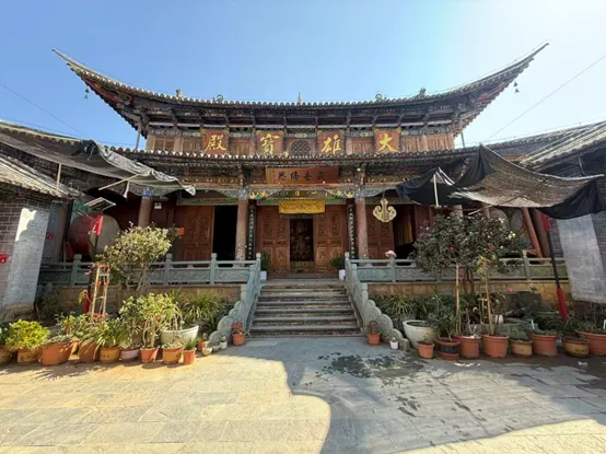 板桥古镇1.5公里的世科村东侧五凤山,藏着一处国保光尊寺(国8),是保山现存规模最大、保存最好的古建筑群,系天宝二年(公元743年)南诏王皮逻阁为祭祀佛教尊神而建,现存建筑多为清朝后期至民国初期重建。该寺坐东向西,依山建成七进五院,共有建筑物23幢。建筑物样式分为三类,其中由西至东分别为山门、过厅(附厢房)、文昌宫(北附翠微楼)、大宝殿(附厢房)、观音殿、斗老阁、瑶池楼、戏楼为抬梁架重檐歇山顶殿宇,其余建筑物均为穿斗架硬山顶平房。光尊寺是保山现存规模最大的儒、佛、道三教合一的古建筑群。