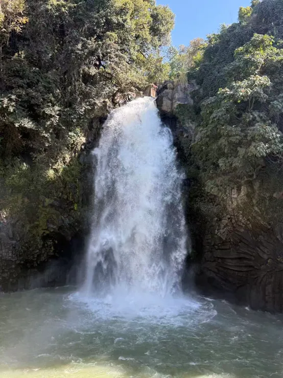 腾冲市内的叠水河瀑布,是全国唯一的城市火山堰塞瀑布。它是约1.2万年前火山喷发后形成断岩,大盈江水流经此处跌落而成,气势磅礴。河水从46米高的崖头跌落,被岩石分成两折,所以叫“叠水河”。水量丰沛时,瀑布如银河倒泻,声震如雷,当地人用“龙洞垂帘”、“久雨不停”来形容。瀑布两侧的崖壁上,排列着整齐的柱状节理群,火山熔岩冷却时形成的六边形石柱,像天然的石柱阵列,这是火山地质的活标本。
