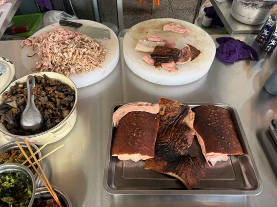 我在保山待的时间不长,印象最深的美食就是火烧肉。火烧肉最独特的地方,是它“半生半熟”的口感,外皮被火烧得焦脆金黄,切开后里面的肉还是粉嫩鲜红的,保持着猪肉最本真的鲜甜。火烧肉的美味,一半在炙烤,一半在佐料的智慧。最经典的吃法是用水腌菜拌,将肉切成薄片,放到装水腌菜的碗里,加入油泼辣椒、蒜泥、花椒、芫荽、酱油等,让人胃口大开。