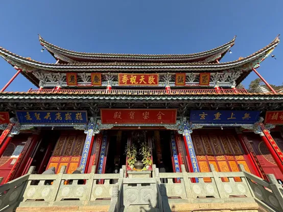 保山玉皇阁(国6):建于明嘉靖二十四至三十八年。明代称毗卢阁,迎晖楼,清代改称玉皇阁。玉皇阁坐西向东,其中主建筑大殿面阔五间,进深五间,通高16.2米,三重檐黄琉璃瓦歇山顶。室内置八角形藻井,顶绘太极图,四壁绘壁画。殿内大梁有“大明嘉靖三十八年(1559年)十一月十七日吉旦立”字样,建筑仍保留明代风格。第二层的牌匾从正面、左面、右面看,会呈现三种不同文字,“至诚无忌”(正面米黄色)、“龙飞凤舞”(左面绿色)、“海晏河清”(右面褐红色)。