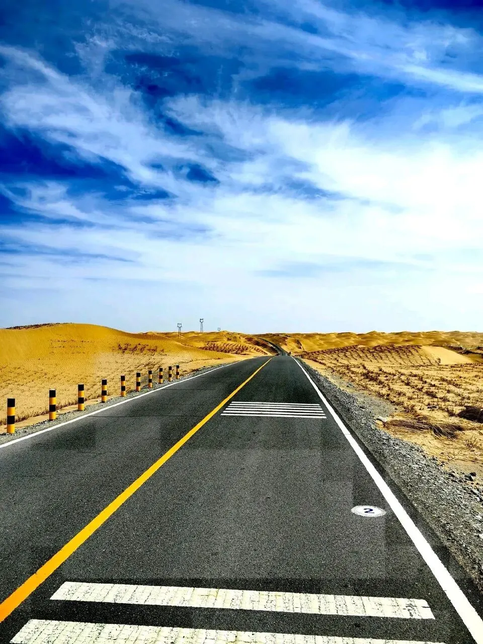 沙漠公路两侧种植了防护林带,绿色与金黄沙海交织,形成独特的视觉奇观。沿途可见胡杨林,秋季金黄,美不胜收。