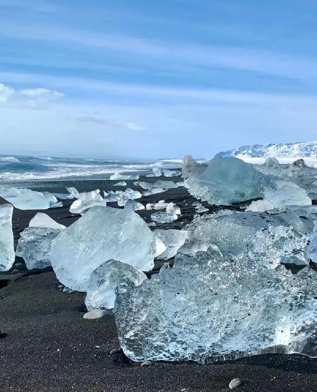巨大的冰山从冰川末端崩落下来,在潟湖里静静漂浮,慢慢漂向大海。湖对面就是钻石沙滩,海水退去后,大大小小的冰块留在黑色沙子上,阳光一照,像未经打磨的钻石。